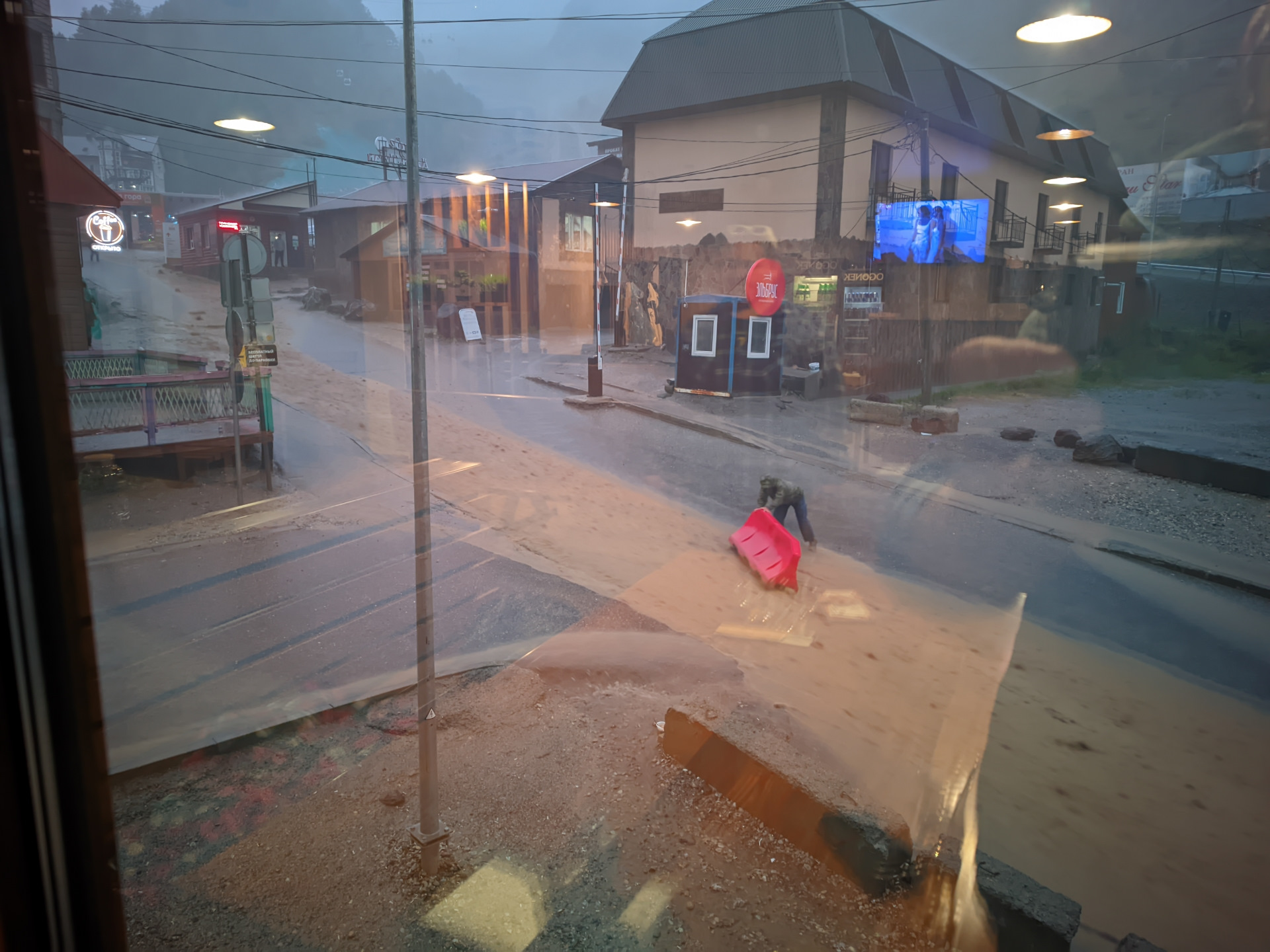 Пока там ходили, по сувениркам, осматривая. Дождь превратился в ливень, дождевики нам пригодились, одели мы их сразу после выхода из кабинки. Мы зашли в кафе, заказали горячий чай согреться, покушать и наблюдали за всём этим через стекло.