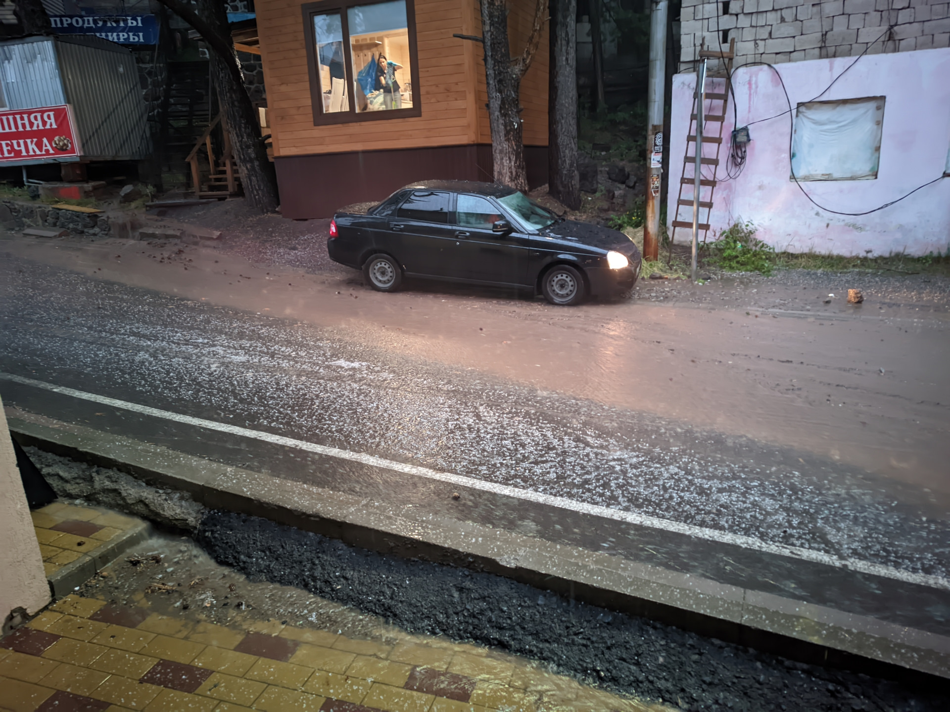 Мы хотели погулять там подольше, но дождь, и уже темнело, не совсем по плану. Постепенно по мере отдаления, дождь совсем стих, но уже стемнело, так же мы хотели погулять, в городу, который проезжали по пути. Интересная архитектура советских многоэтажек, я такие не видел нигде, да и вообще интересно. Если бы знал и планировал бы заранее сам всё маршруты, то наверное остановился бы где-то там на несколько дней, после Кисловодска. Тогда можно было бы и погулять, и подняться на подъемниках на Чегет. Но меньше времени бы гуляли по Кисловодску. В общем времени как всегда мало, да и вообще надеялся неделю там, а вторую уделить сварке. Но нет, потом починки, деревня, картошка и всё такое, и раз — снова на работу.