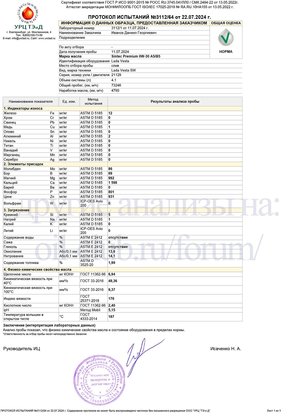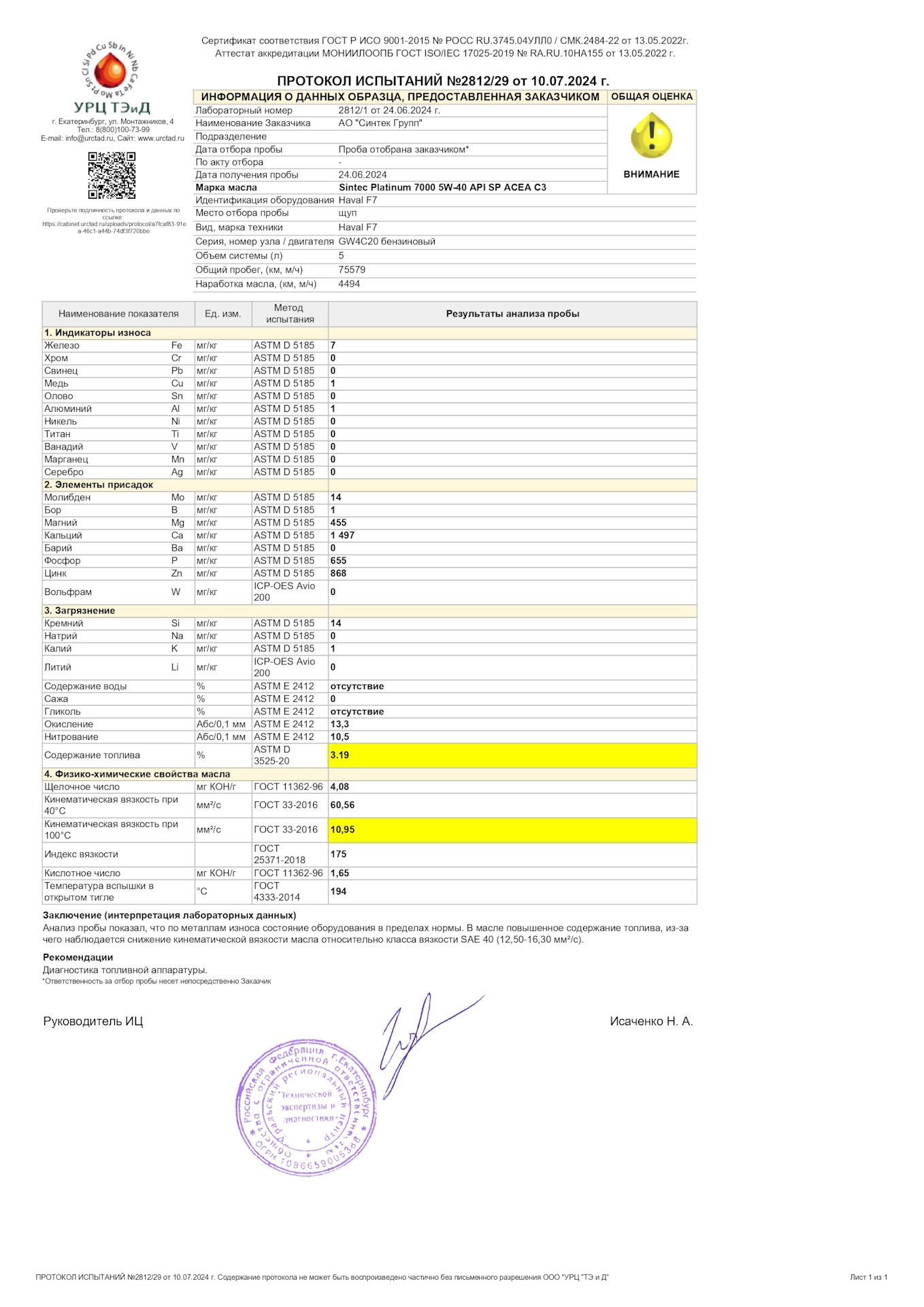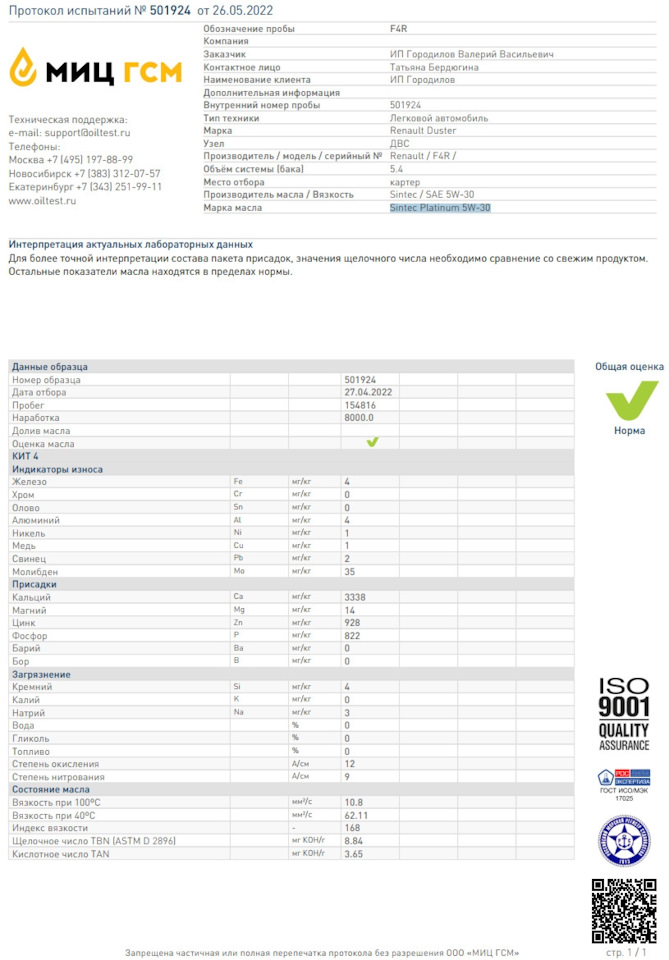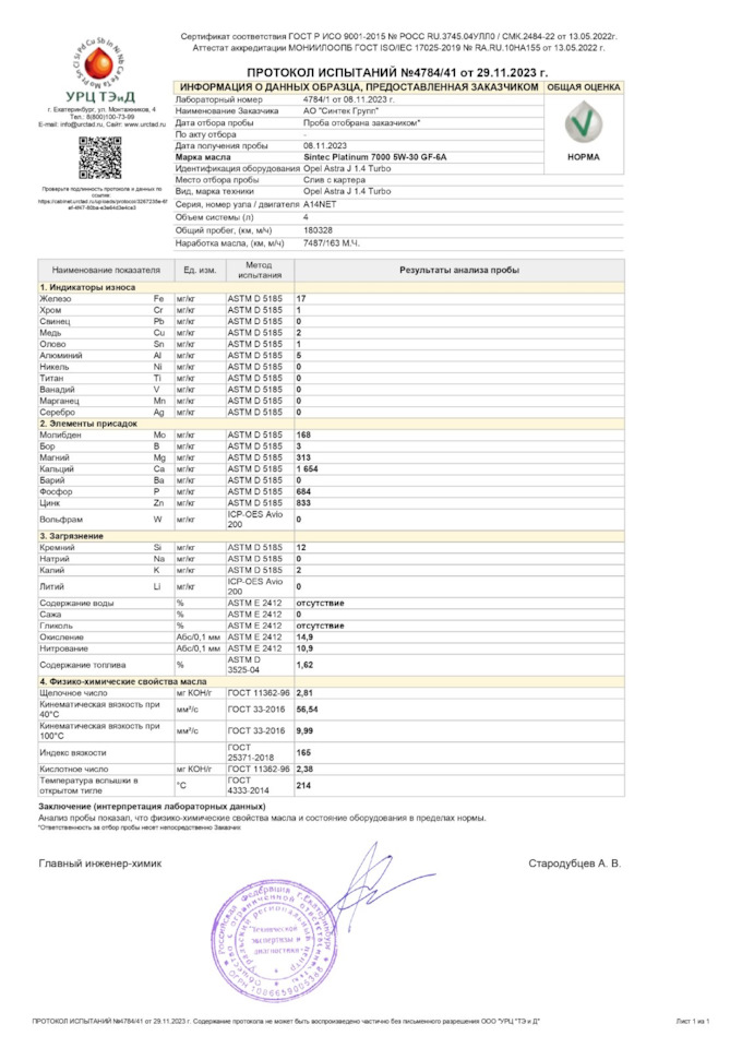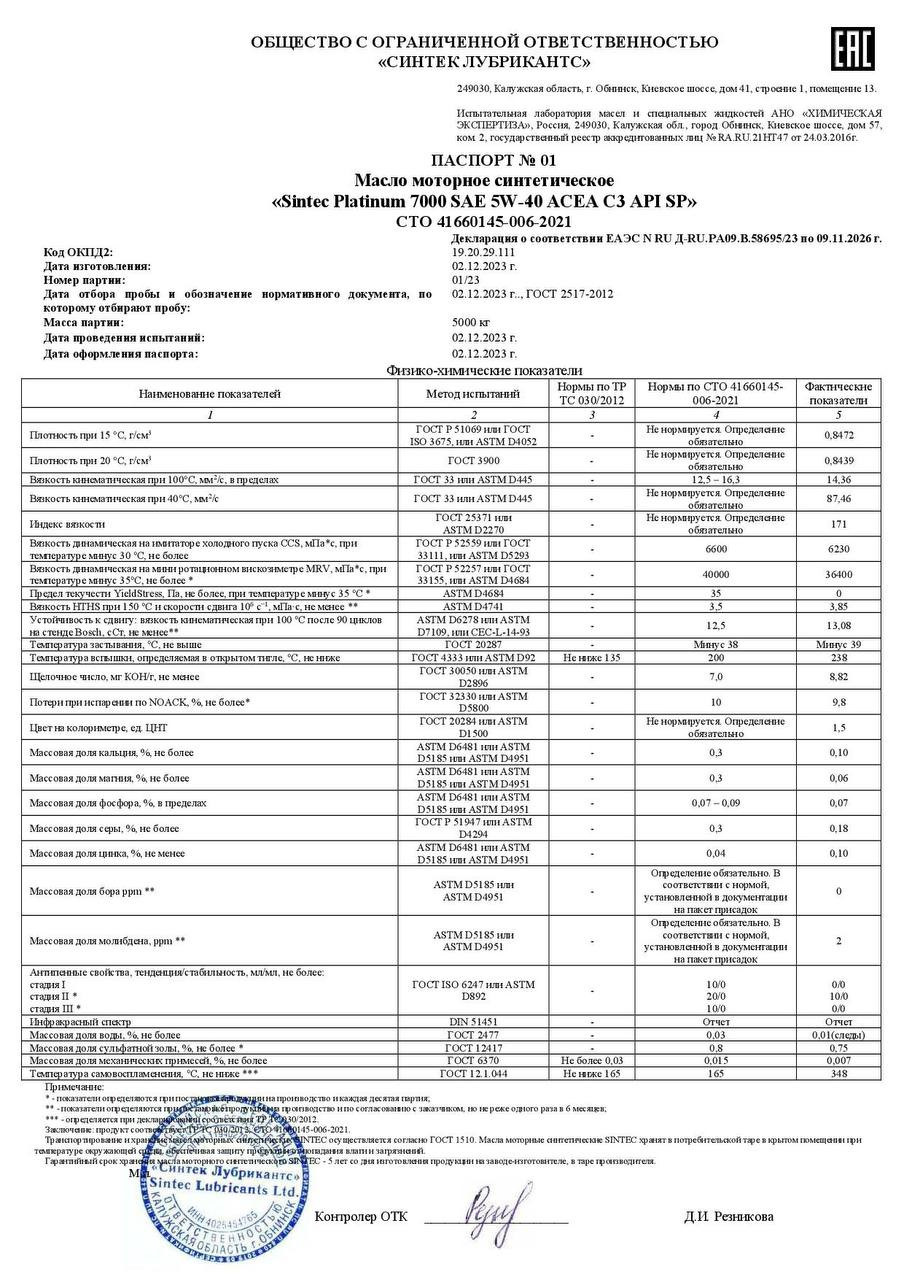 Сделал второй анализ отработки масла Sintec Platinum 7000 5W-40 API SP ACEA C3