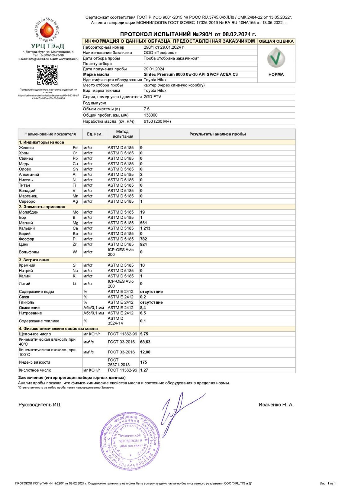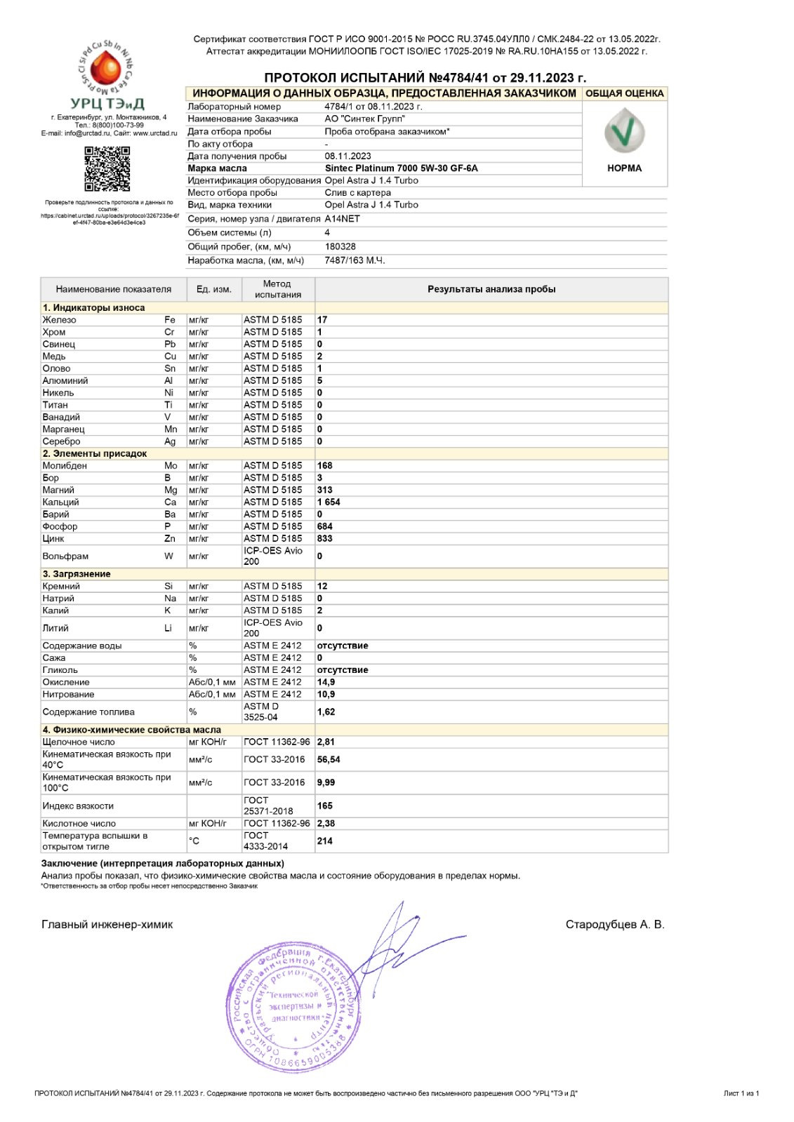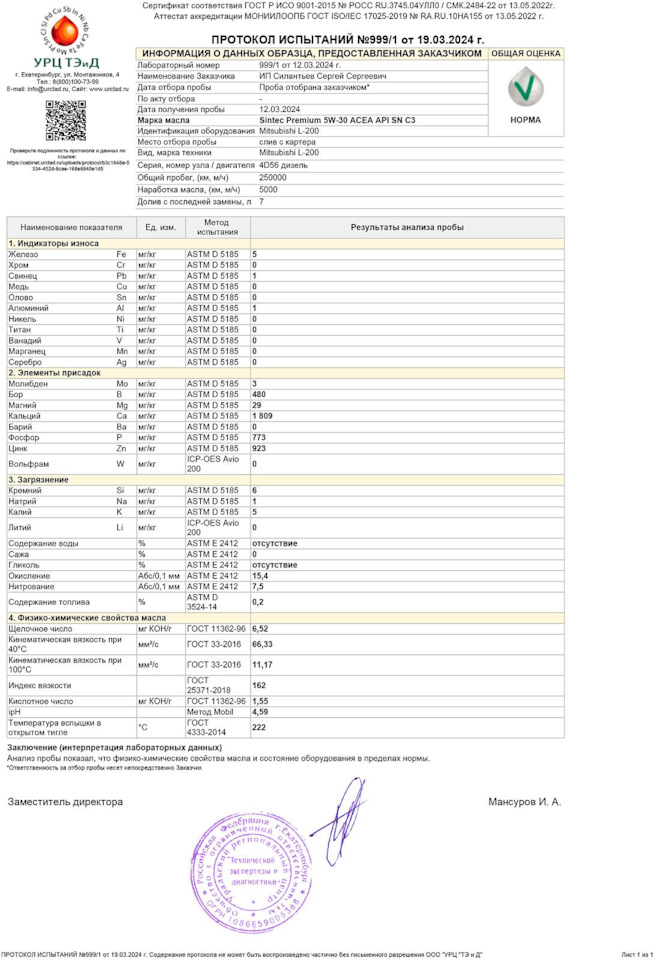 "Масло по анализу ойлклаба по содержанию Ca Zn P S и ТД соответствует "