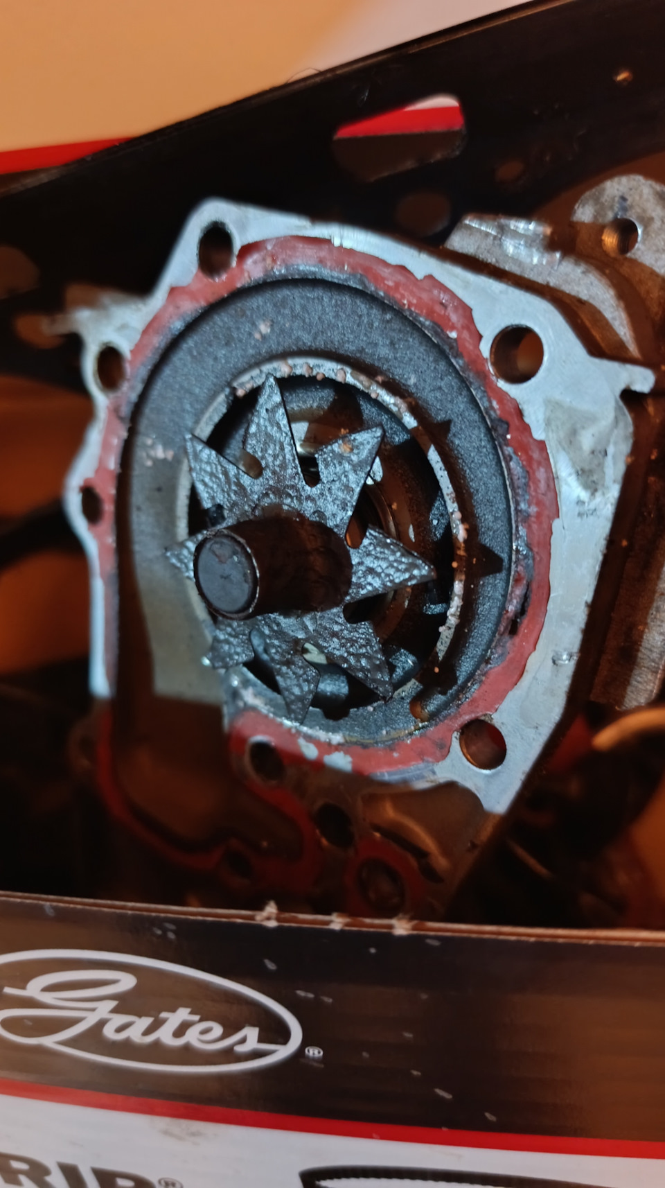 Печальная ситуёвина… Где же теперь эти выступающие лопасти с крыльчатки помпы, как бы они не стали причиной забитых каналов в системе охлаждения.