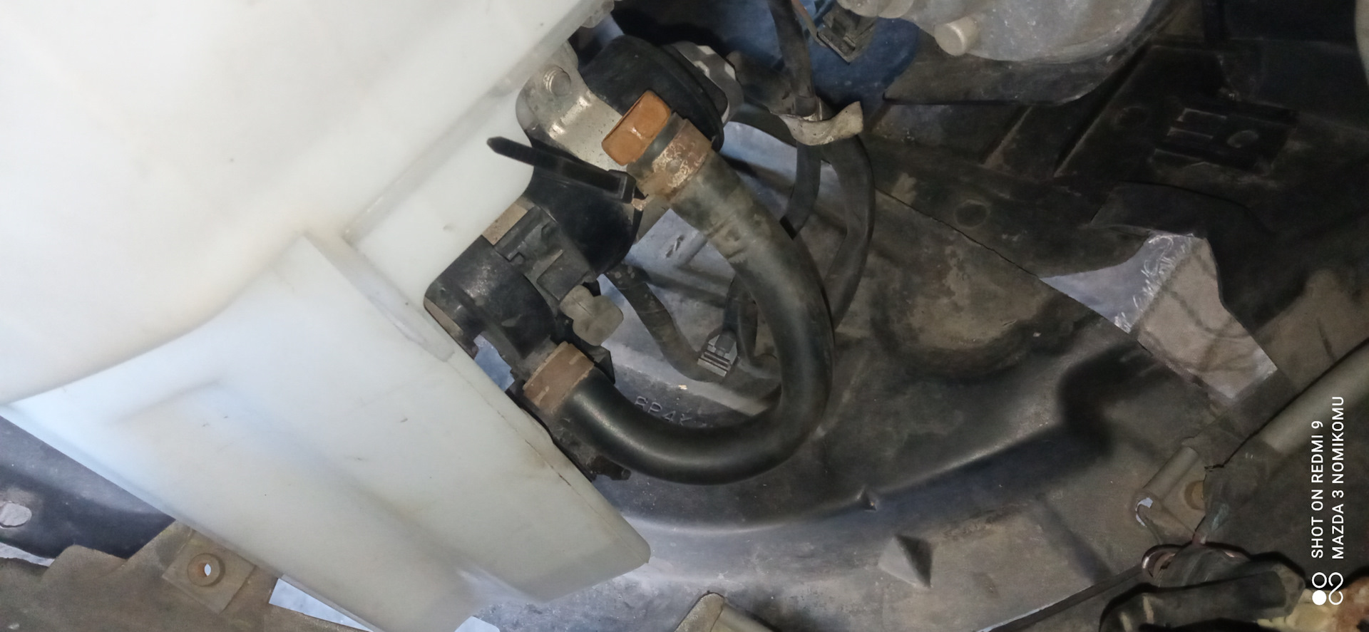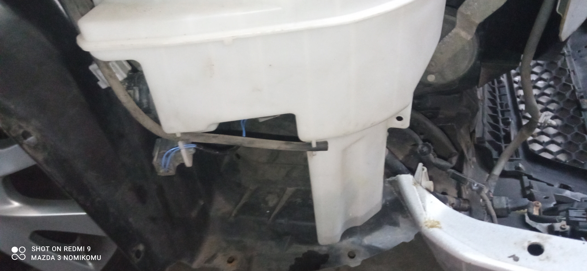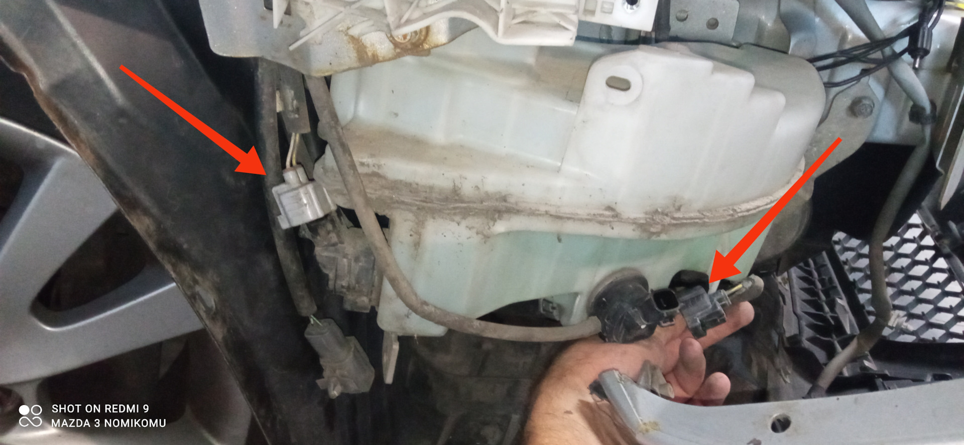 Теперь бачок можно снимать, предварительно отключив два разъема (для омывания ветрового стекла и заднего) и два шланга с моторчиков (также, соответственно) а также крепление проводки разъемов к бачку (удобно снимать длинногубцами, зажав усики клипсы проводки).