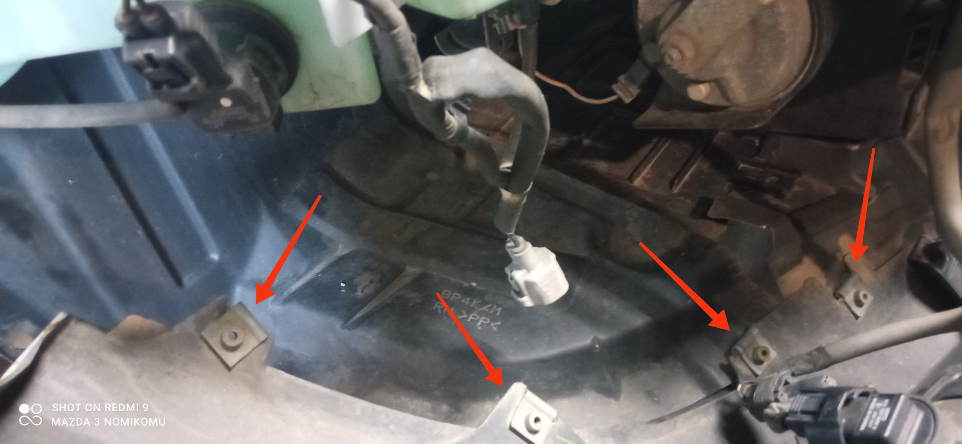 Теперь бампер можно сдернуть, но для удобства еще бы рекомендовал открутить четыре правые нижние винта крепления переднего пыльника двигателя, так бампер можно будет отогнуть для более комфортной работы с бачком омывайки.