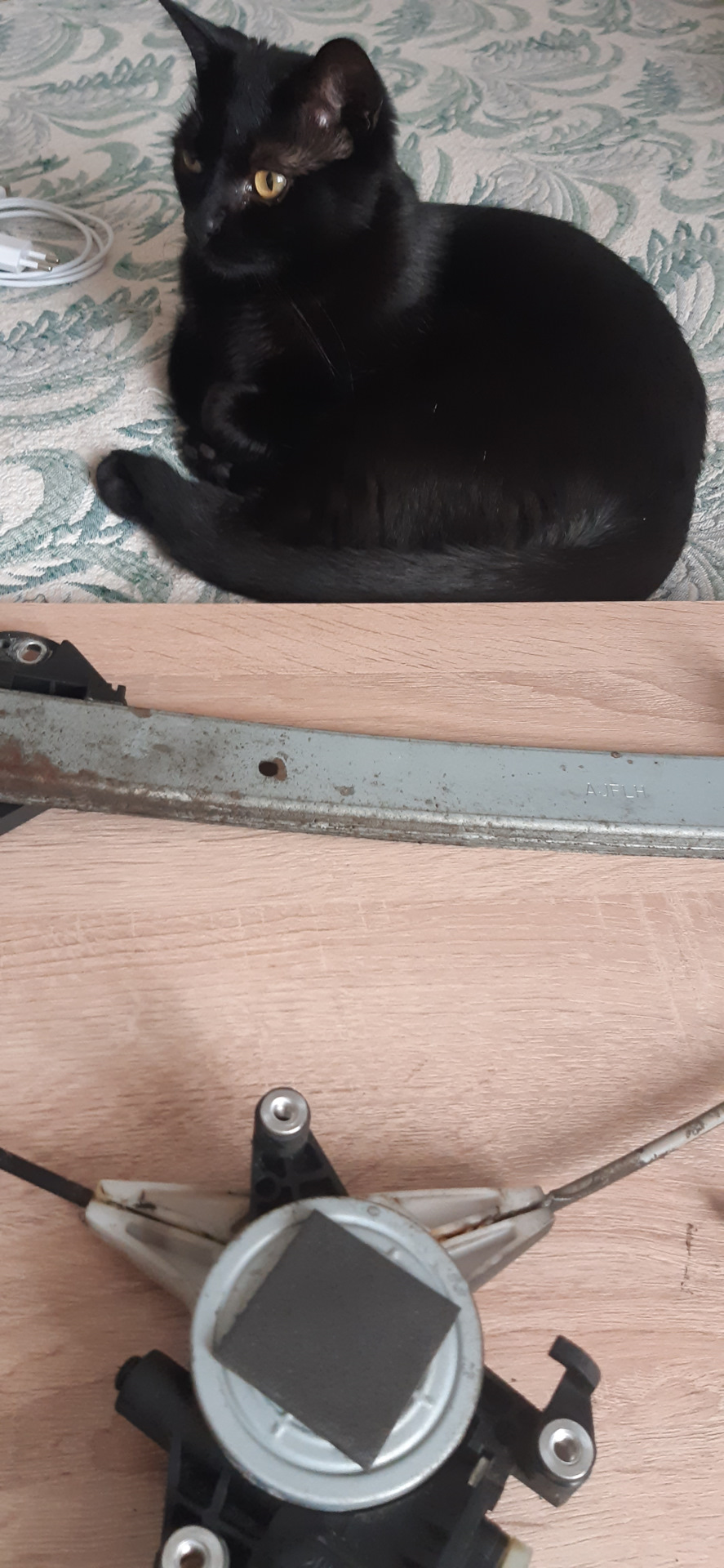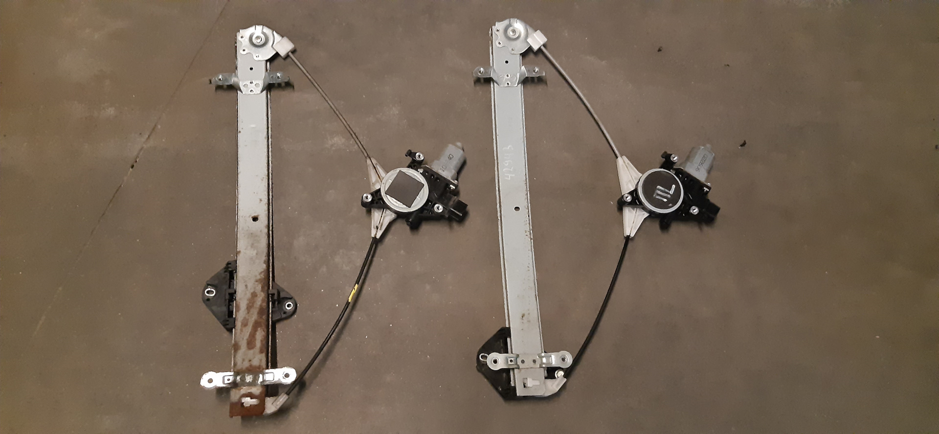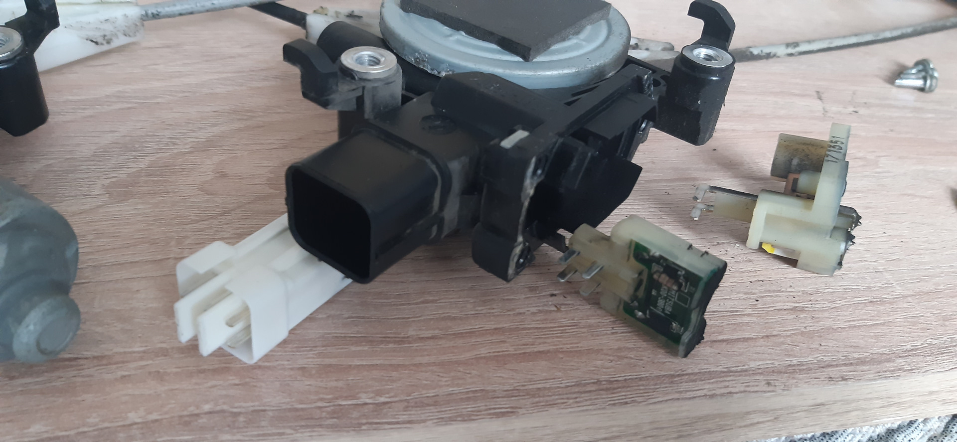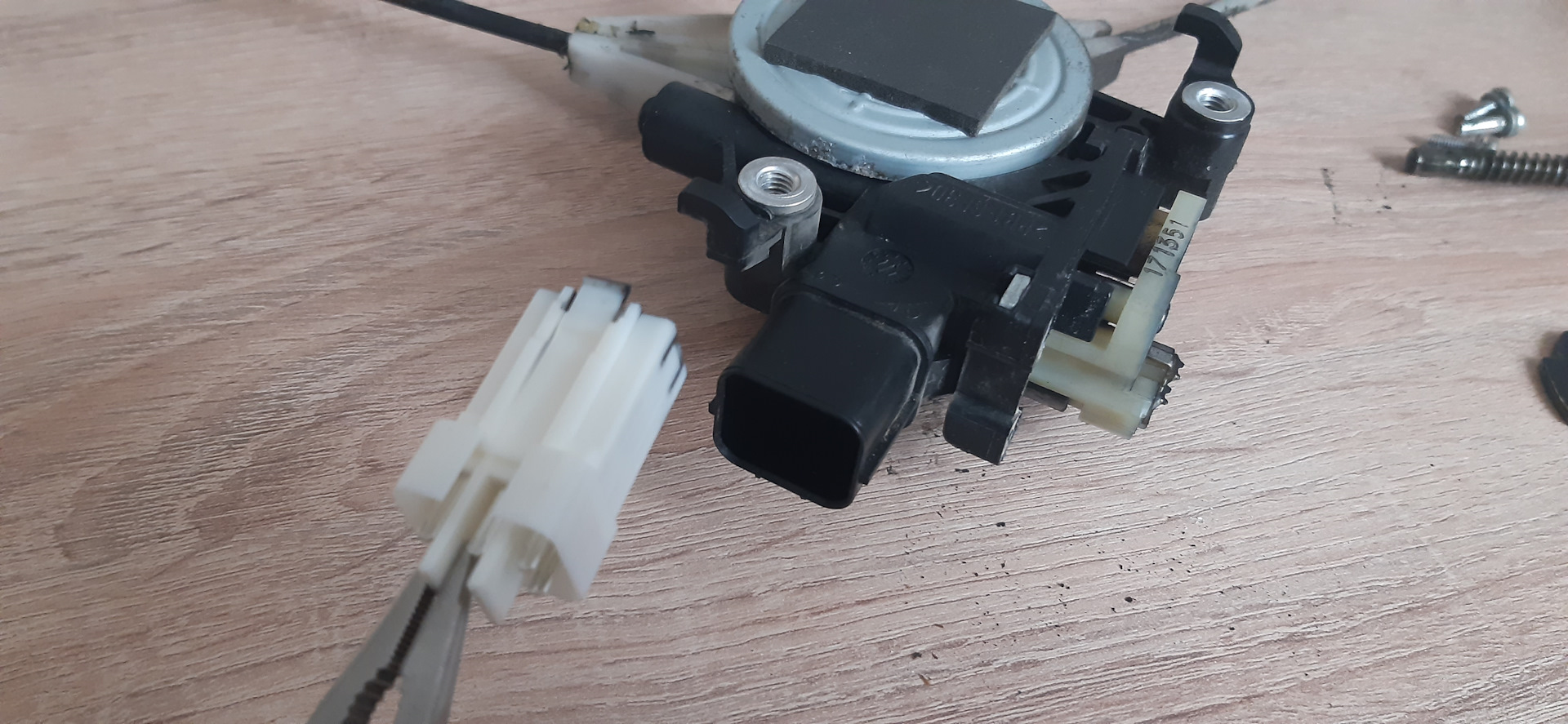 Само железо (направляющая с тросиками) для нашей передней левой двери нужны с левой двери пруля. Начинку мотора и разъёмы, как писал, переставляем свои.