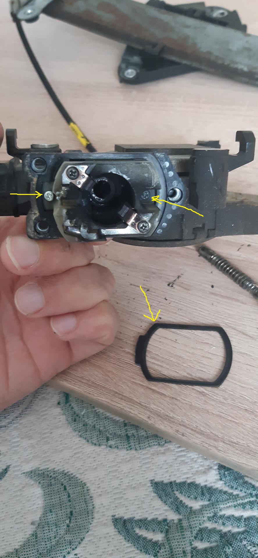 Далее снимаем резиновую прокладку, откручиваем 2 винтика и вытаскиваем пластиковый элемент с щётками, а за ним небольшую плату с контактами.