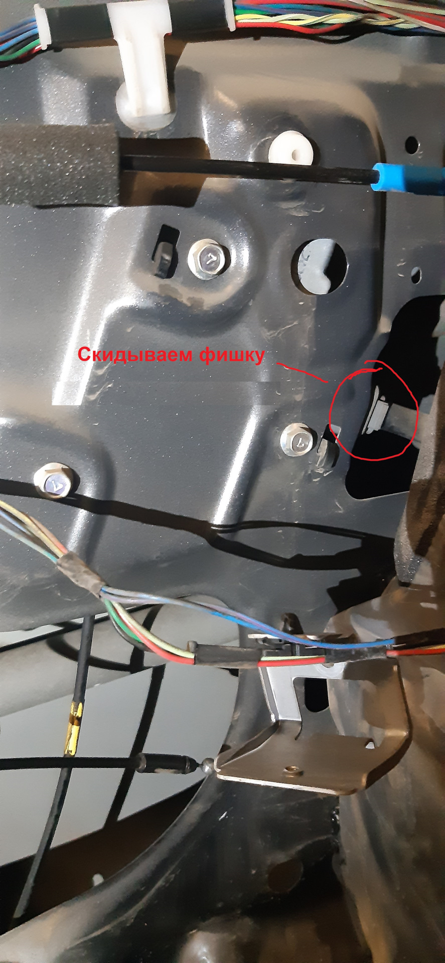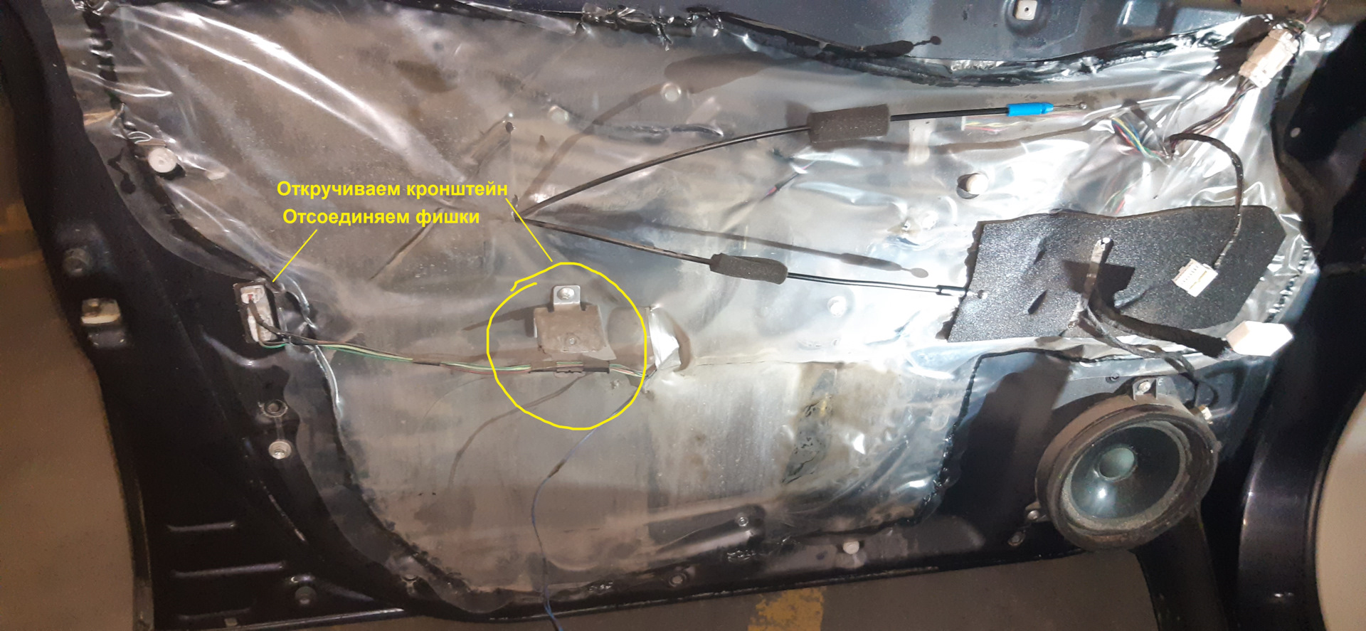 Отцепляем все тросики и фишки, кроме большой, которая идёт к блоку стеклоподъёмника. Опускаем стекло, чтобы "каретка" с крепёжными болтами оказалась в зоне доступа (в окошке). Либо это можно сделать изначально, не опуская стекло до самого низа на 10-15см.