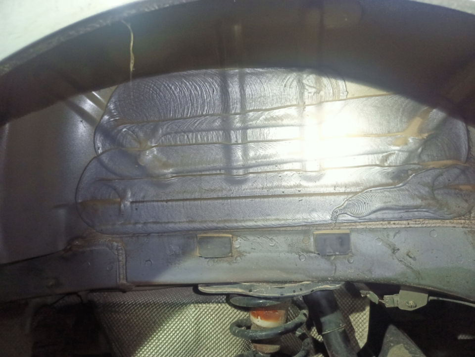 Я был удивлен, когда через год залез под машину и увидел, что то что я нанес на днище не стёрлось о траву на рыбалке. Но, так как я тестю покрывал днище этой же смесью, то обновил и у себя немного днище. Остальные места не трогал, они тоже были мокрыми.