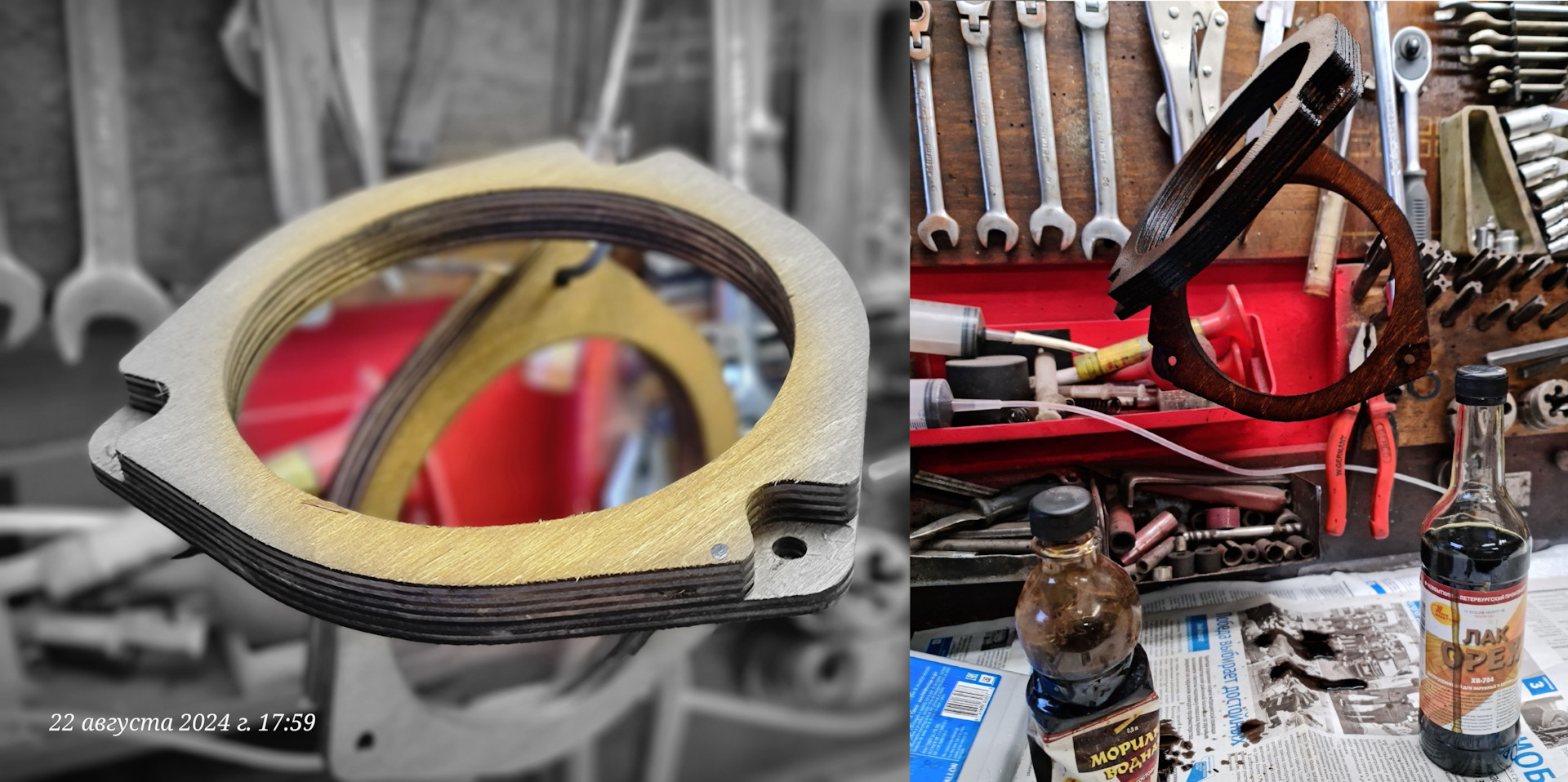 Кольца брал на Озоне, покрывал олифой 3 слоя, затем лаком 3 слоя, чтобы не разбухали.