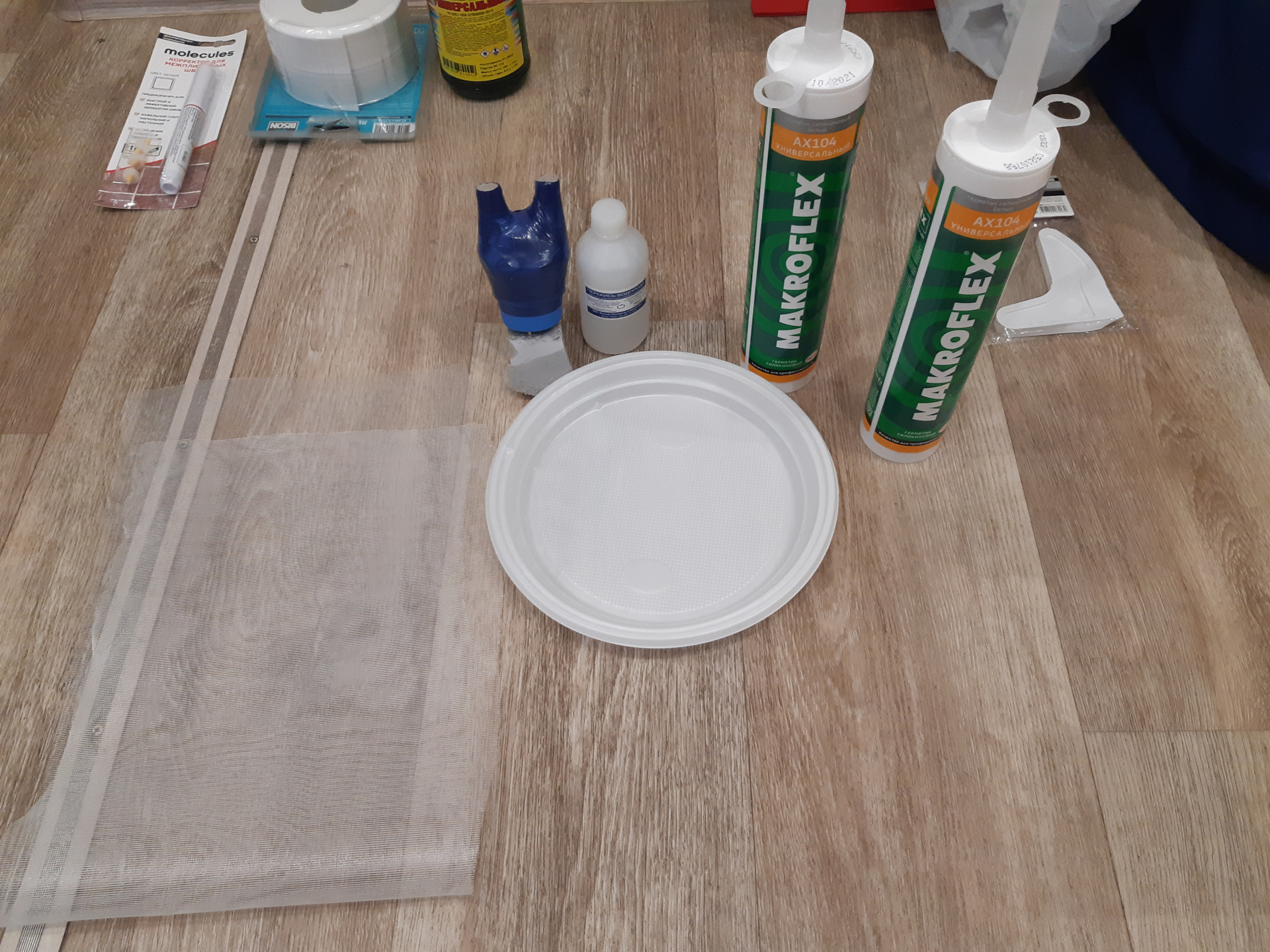 просто обмазать шаблон герметиком было бы неправильно, во первых герметик легко порвется, во вторых силикон стечет на одну сторону и толщина стенок будет разной, решил армировать тканью. Но обычная тряпка не пойдет, трудно пропитать герметиком ее, надо что-то типа марли. Но марлю тоже трешил не использовать, побоялся, что хлопок будет тянуть влагу и быстро сгниет, Надо что-то синтетическое… Пометался по дому, и на глаза попался идеальный материал-ТЮЛЬ! По сути синтетическая сетка, то что надо! Терпежки нет, осмотрелся по сторонам и пока жена не видит, вырезал кусочек тюля, с мыслями тут за шторой все равно не видно)))