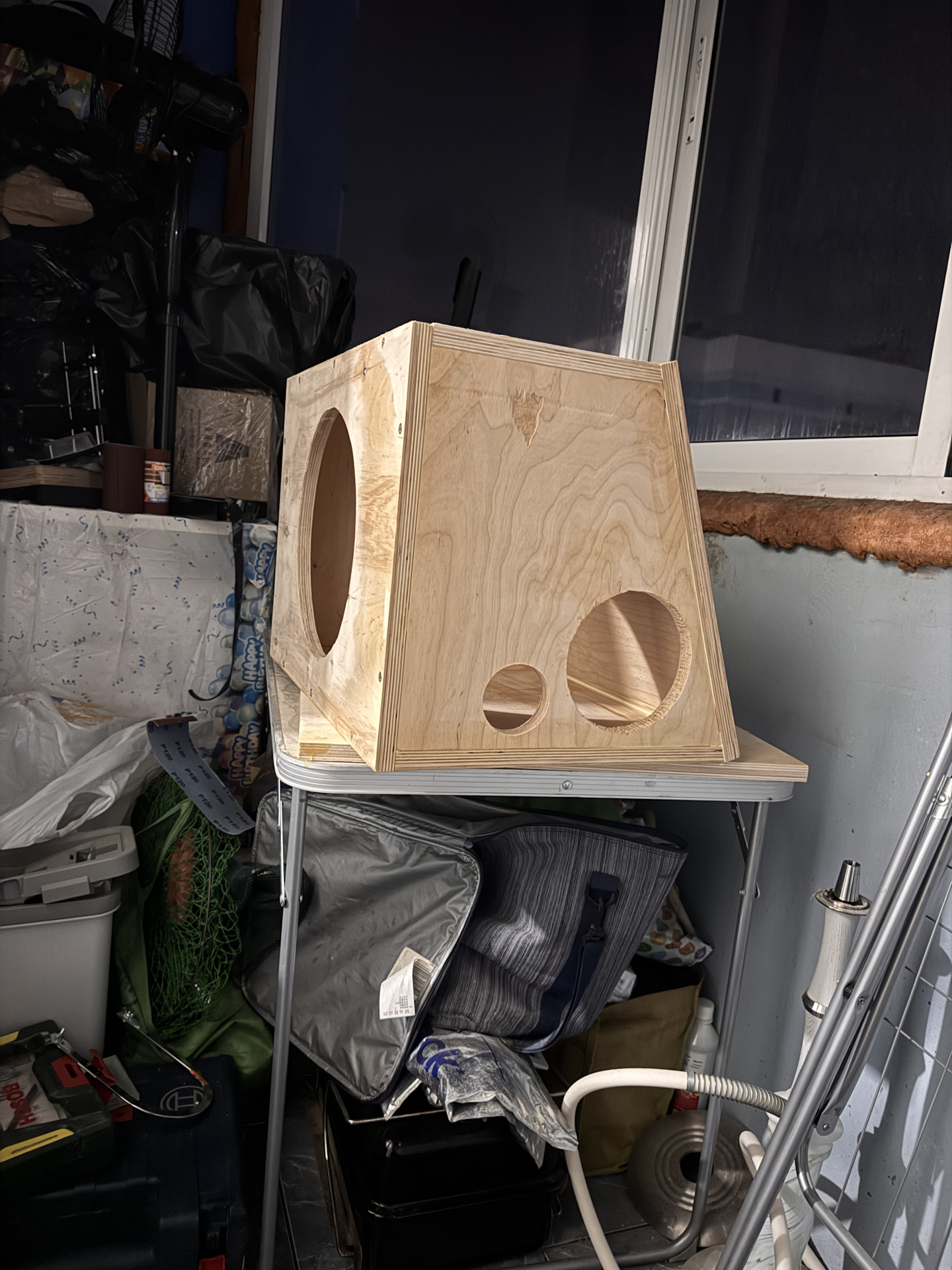 Дальше собираем, проклеиваем, стягиваем саморезами, предварительно засверлившись, чтобы фанера не лопнула. Клеим тайтбондом синим. Трубу решил покрасить. Оставалась черная матовая краска в балончике.