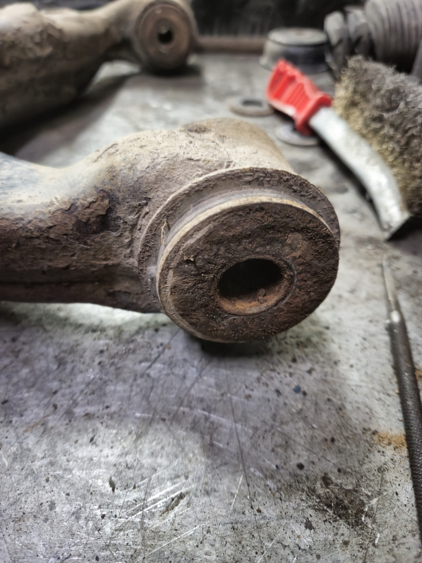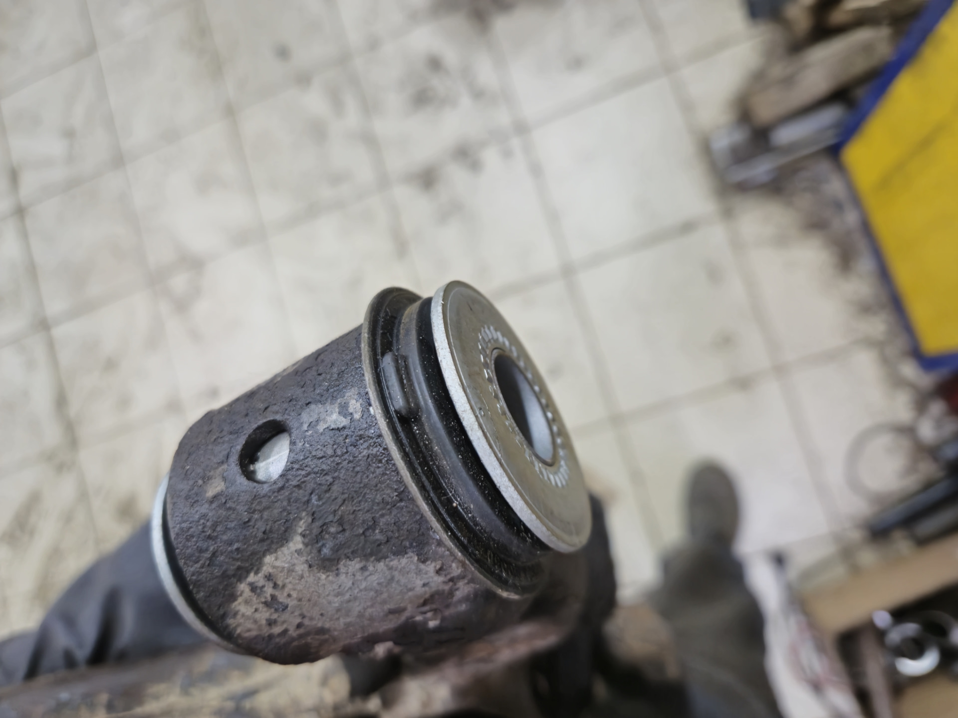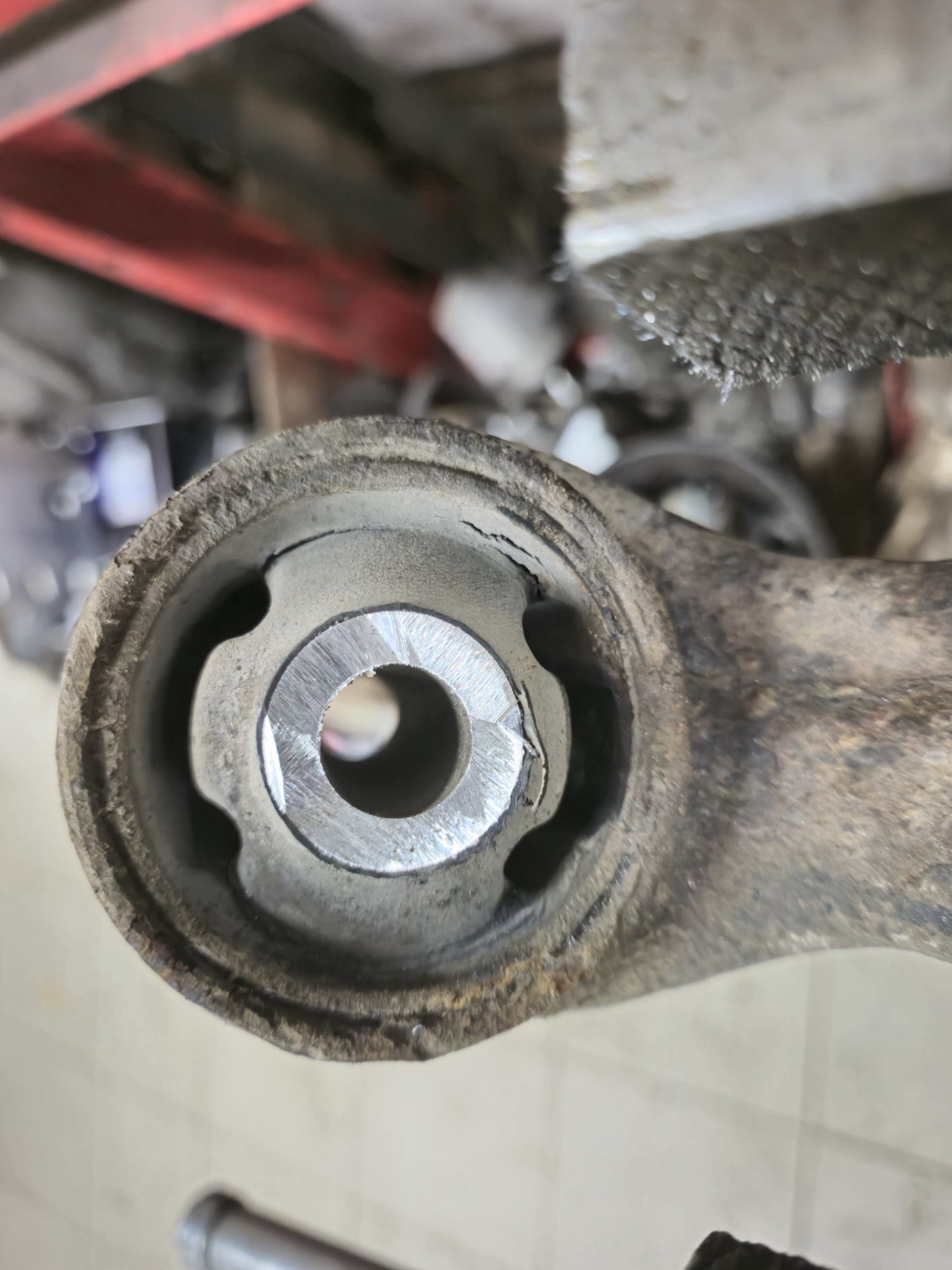 Приступил к разбору, отркутил рычаг без проблем. Болт амортизатора и два развальных. Рычаг в руках. Срезаю шайбы, выпресовываю середину и после достаю внешнюю часть сайлентблока из рычага. Сидели очень туго, изрядно пришлось повозится чтоб вытащить. Заранее надо не забыть запомнить позицию в которой были установлены!