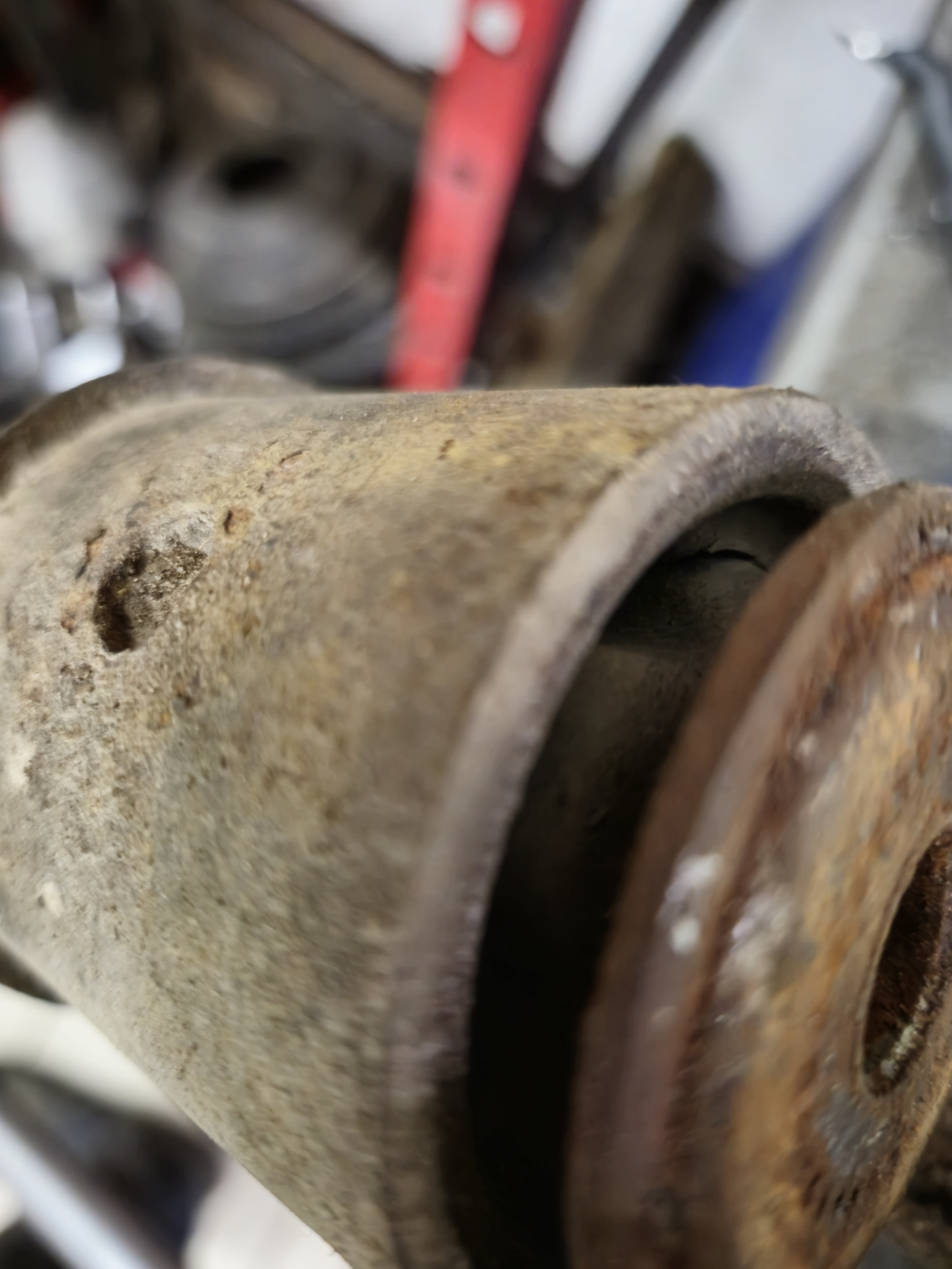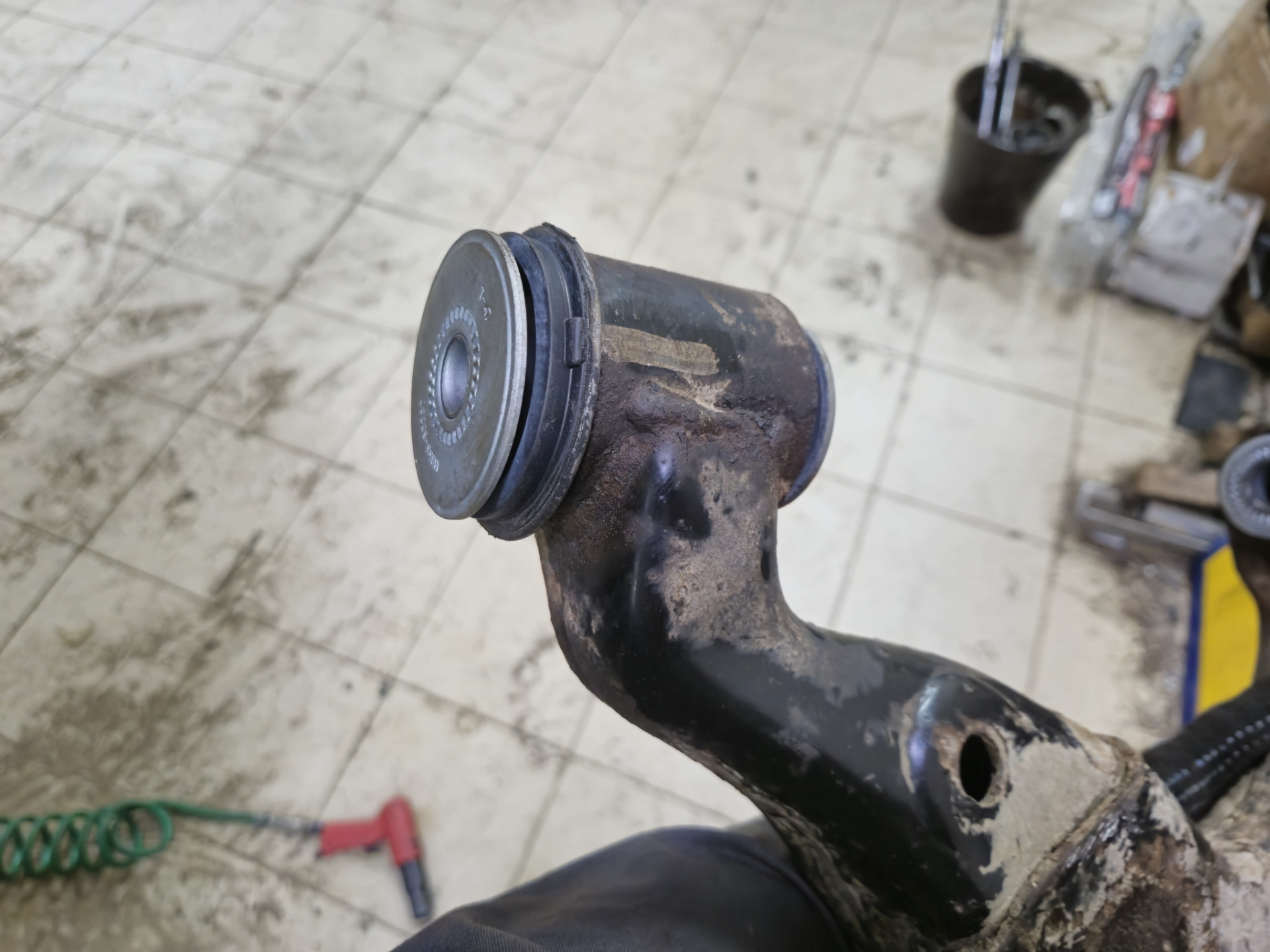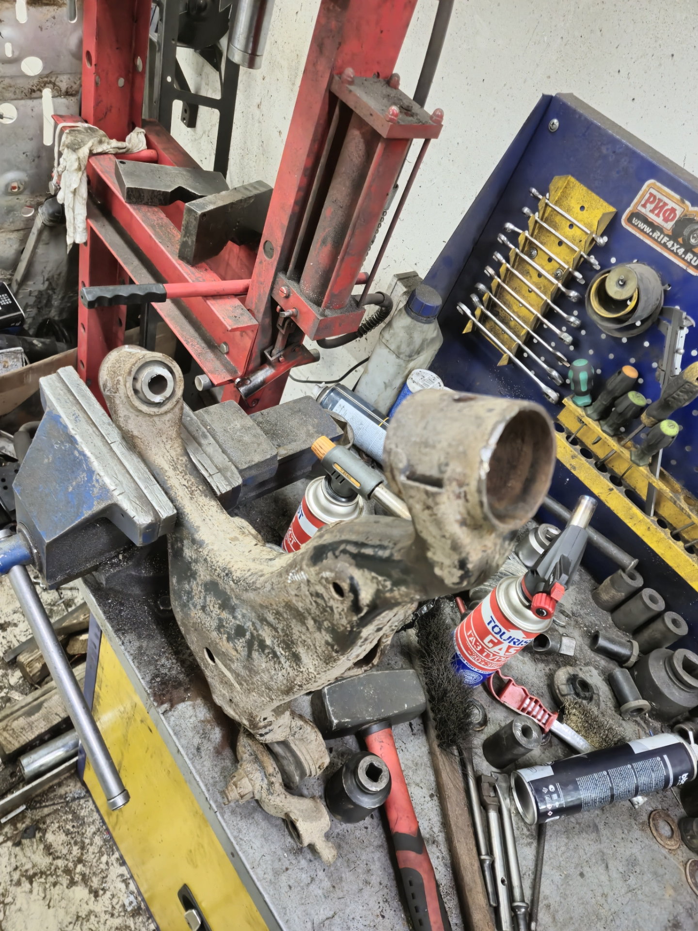 Приступил к разбору, отркутил рычаг без проблем. Болт амортизатора и два развальных. Рычаг в руках. Срезаю шайбы, выпресовываю середину и после достаю внешнюю часть сайлентблока из рычага. Сидели очень туго, изрядно пришлось повозится чтоб вытащить. Заранее надо не забыть запомнить позицию в которой были установлены!