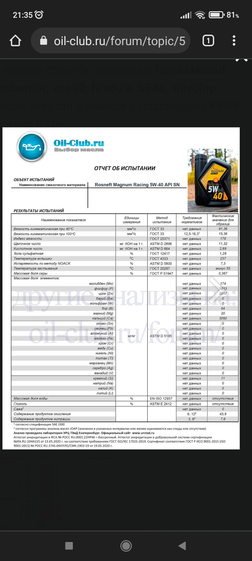 Я ждал эту тему) анализ масла с ойл клуба датирован 21-м годом, когда у роснефти был доступ к импортным присадкам, и масло реально было ТОП, из российских точно, для тяжелых условий… Сейчас скорее всего мешают на китайском Фулл Рич, а это не то пальто и никто еще анализ этого масла, свежего, после 2022г, не делал, и что там сейчас в реале, никто не знает… Так что думаю 5-7т.км отработает! Но для понимания и верности, сдать бы потом отработку, да и свежее масло на анализ, понять бы, что там сейчас!