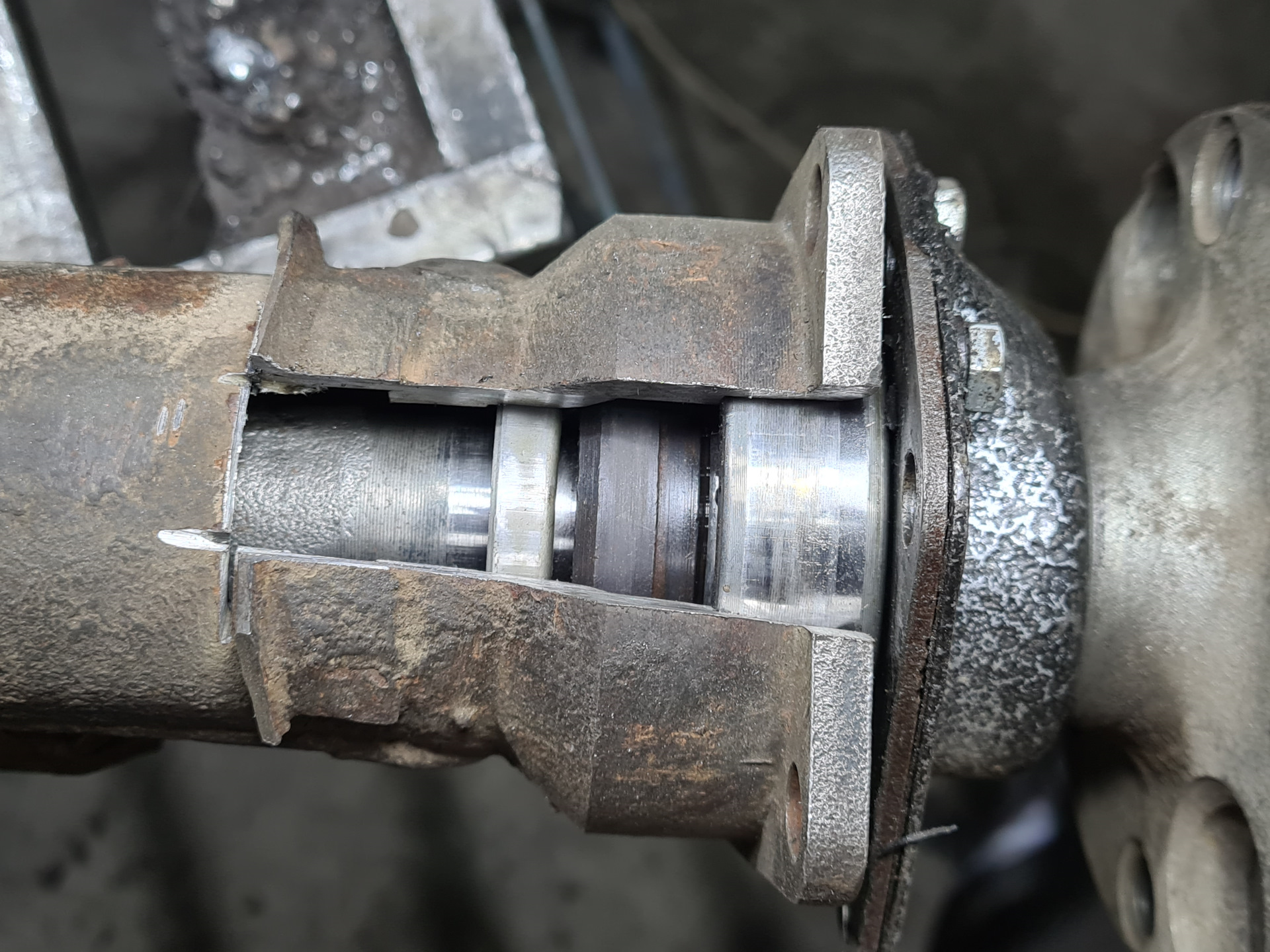 Вскрыл чулок моста чтобы увидеть как всё расположено внутри со штатной полуосью