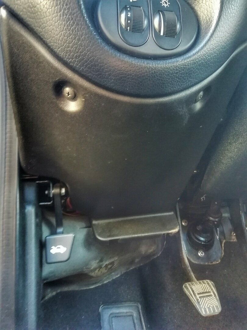 Монтажный блок расположен в салоне автомобиля слева от рулевой колонки снизу. Чтобы до него добраться, открутите два самореза на фото ниже и снимите крышку: