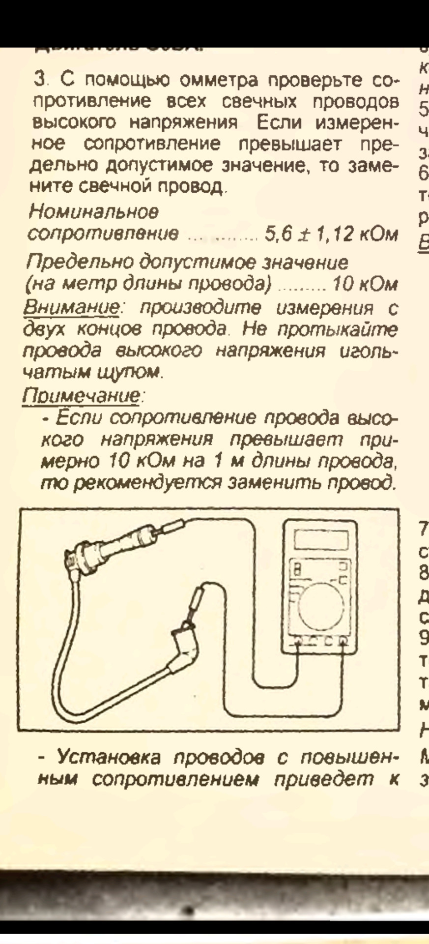 Мануал говорит, что предельно допустимое сопротивление ВВ проводов 10 кОм на 1 метр длины. Вот скан из Спортажевского мануала от Легион-Автодата.