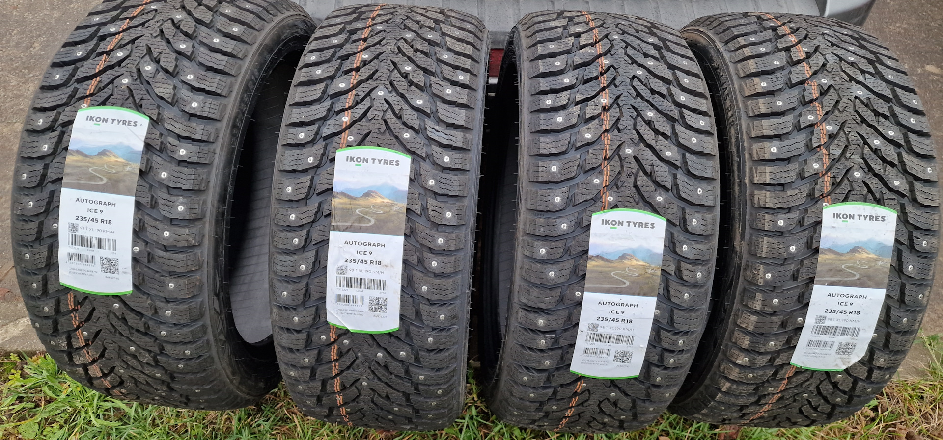 Но так как ни ту ни другую сейчас не найти, по крайне мере по адекватной цене, выбор остановился на Ikon Autograph Ice 9 Studded (Ikon Tyres) 235/45 R 18 98T XL. Тот же самый бывший завод компании Nokian, который разрешил производителю выпускать шины предыдущего поколения Nokian Hakkapeliitta 9, но уже под другим названием.