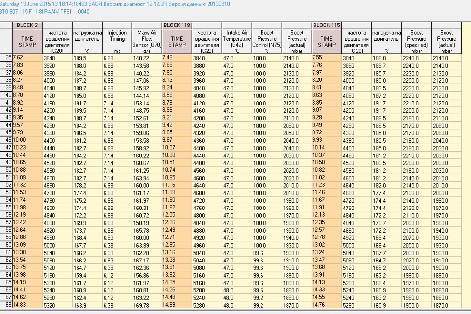 И как итог проделанной работы вашему вниманию логи! Наддув в пике 1.28 бара (запрос 1.41)