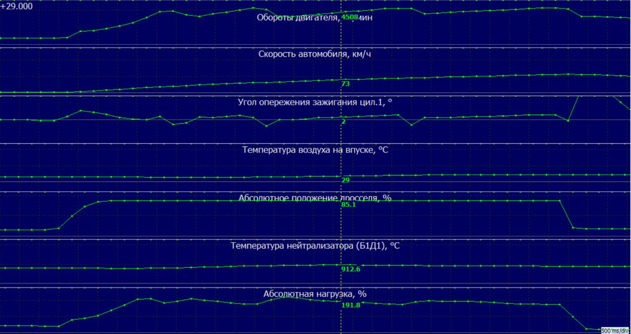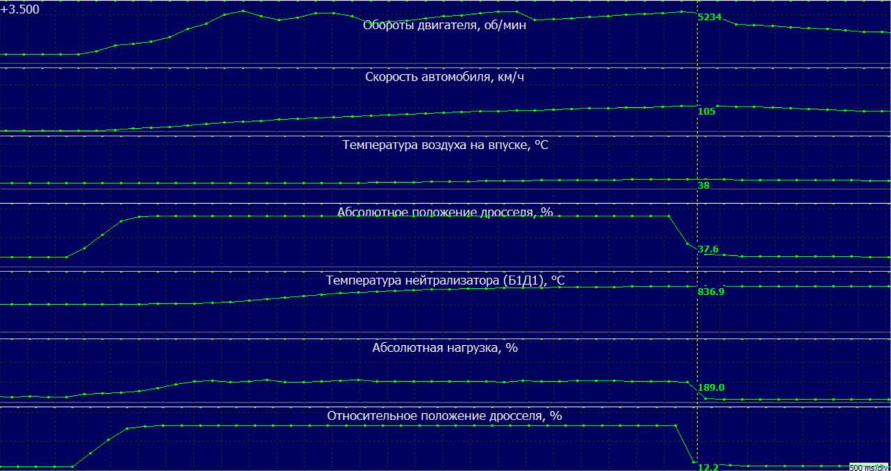 Когда смотрели логи до прошивки и после, заметили одну интересную вещь — температура выхлопа ДО ПРОШИВКИ (при разгоне "в пол" с 0 до всего 70 км/ч) составляла около 910 градусов. ПОСЛЕ прошивки (при разгоне "в пол" с 0 до 105 км/ч) температура выхлопа получилась около 830 градусов! По идее, с увеличением мощности, температура должна только расти… А тут наоборот, значит турбина и катализатор целее будет, это прекрасно.