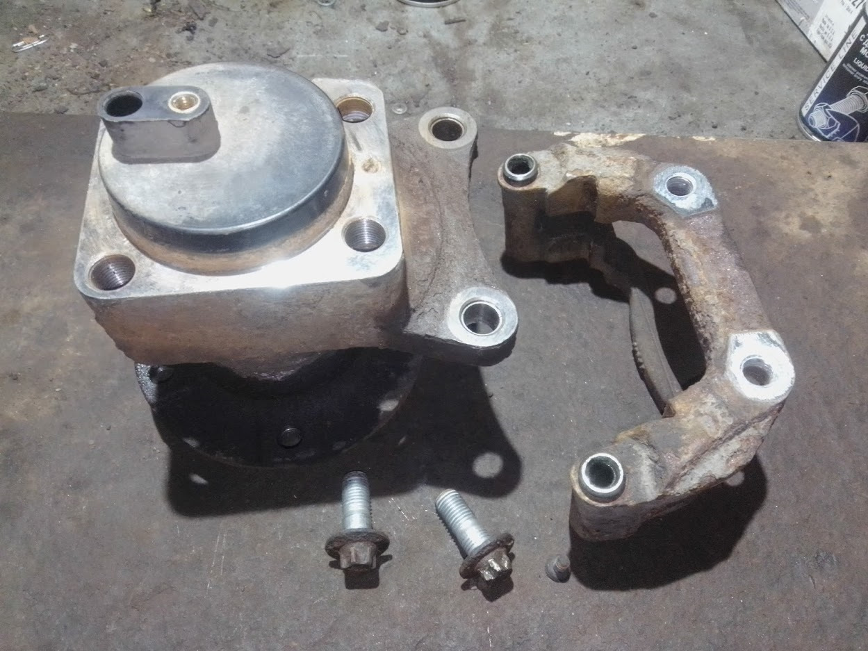 Чтобы снять скобу торм.суппорта, мне было проще снять ступицу в сборе и открутить эти два болта на верстаке.