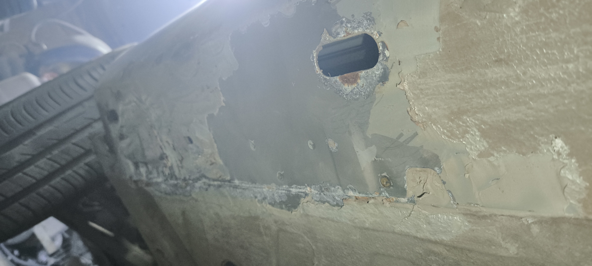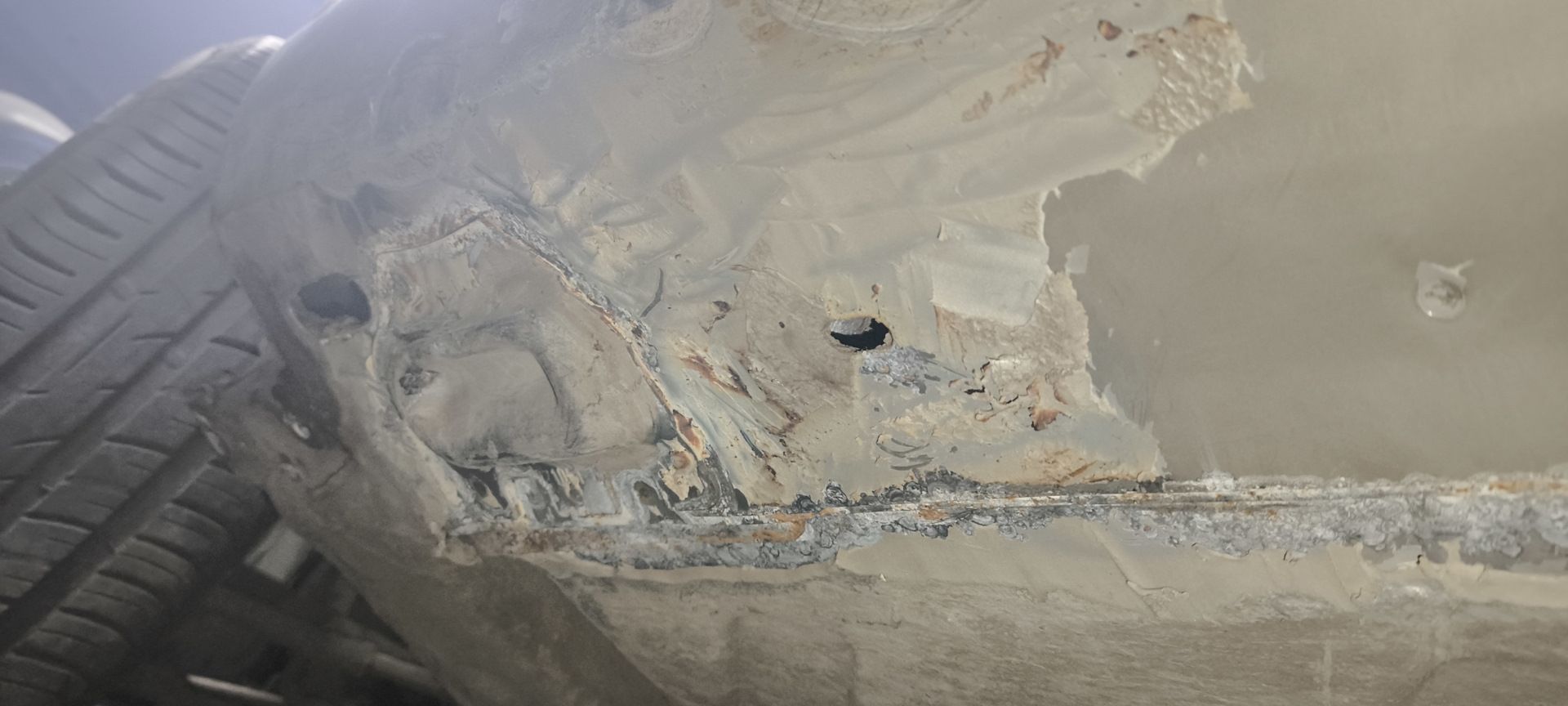 Заодно сразу решил проверить состояние порогов. Так как левый был давно замят, тянуть с ним было нельзя, плюс родной герметик начал отслаиваться и туда поступала влага. Решено все вскрывать и досконально смотреть. Люди не тяните с замятыми порогами, тем более если поврежно лкп. Все это приведёт либо к замене порога, либо к заплатке. Зачем этот не нужный геморой?