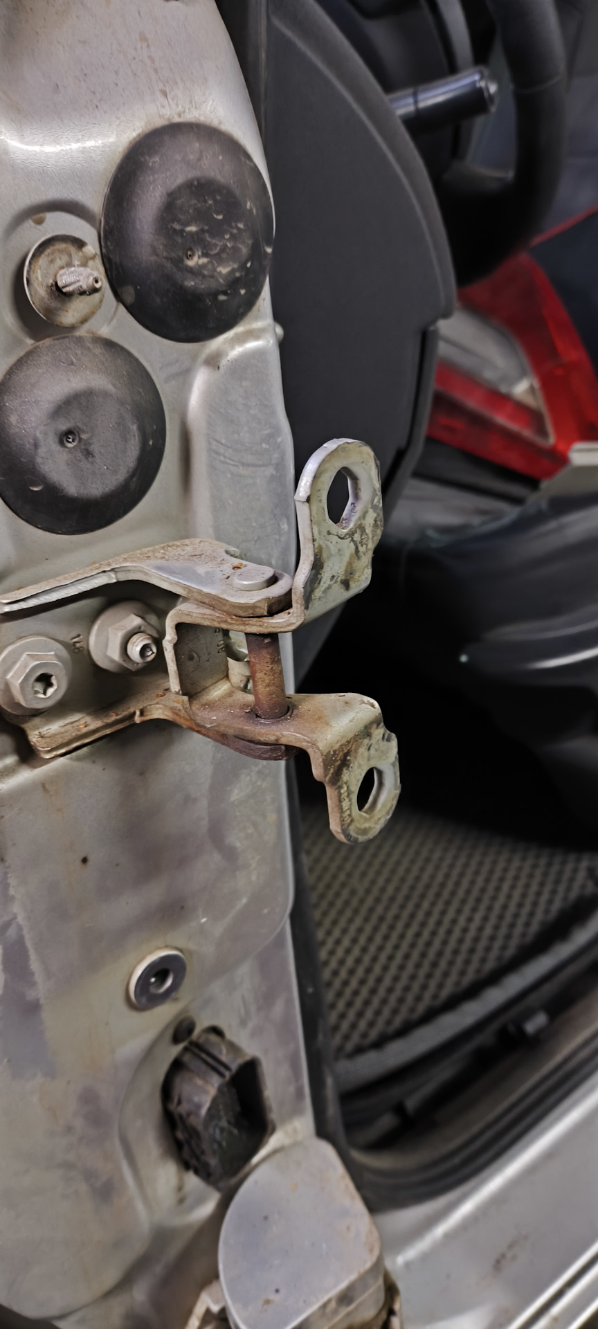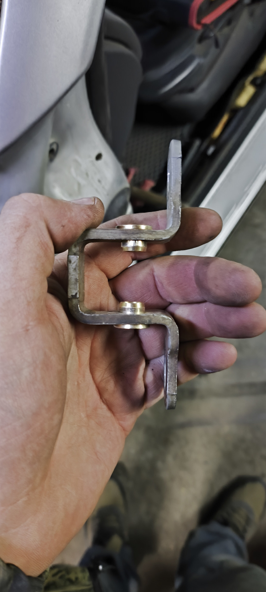 Так же с момента покупки напрягала верхняя петля двери(был люфт). Решил это сразу устранить, был куплен ремкоплект пальцев с втулками у китайцев. Тут не обошлось без подвоха. После установки всего, палец прокручивался во втулка и мог вылететь, пришлось прихватить на сварку и подкрасить. Люфты ушли, только замучался регулировать ригель, чтоб дверь закрывалась так как мне надо)) парни хотели выгнать с сервиса уже, достал их хлопаньем двери и подгонкой))