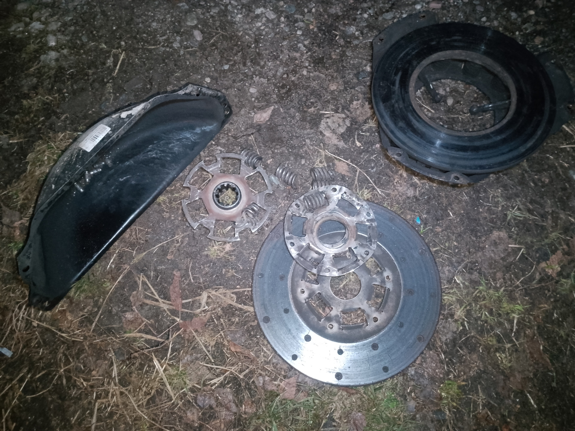 Диск сцепления порвало — вырвало заклёпки, и пружины разлетелись по корзине сцепления. Видимо, в какой-то момент шестерни упёрлись друг в друга зубъями, и сцепление не выдержало инерции маховика в паре с крутящим моментом двигателя.