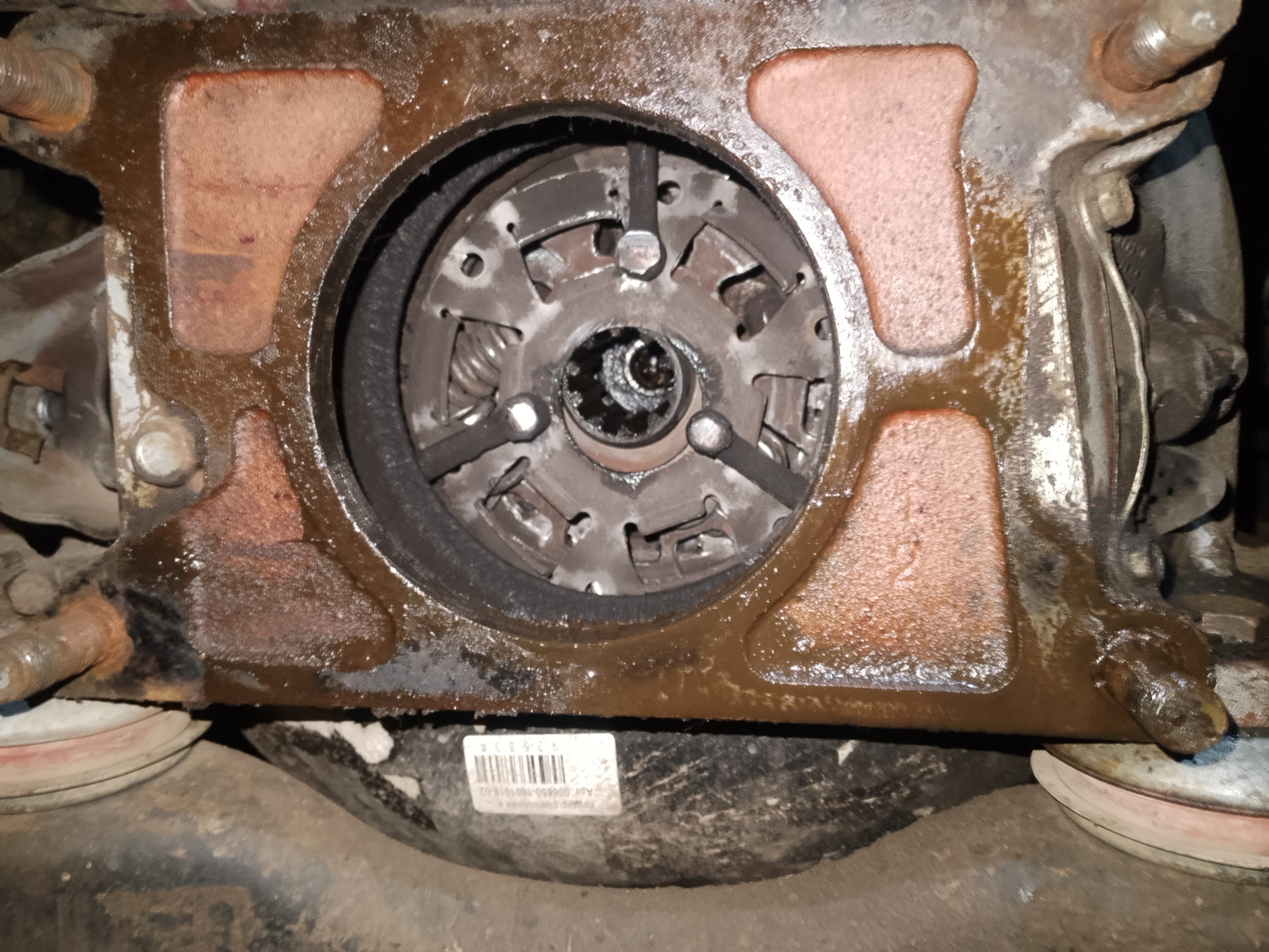 Сцепление устанавливать не сильно просто — между траверсой и маховиком недостаточно места, чтобы корзина сцепления с новым диском туда вошла. Сначала нужно установить диск на своё место, затем придерживать его и вставлять корзину. До конца она не входит, в какой-то момент надо немного подстучать её кувалдой или чем-то тяжёлым (например первичным валом от старой коробки, который был приготовлен для центровки сцепления).