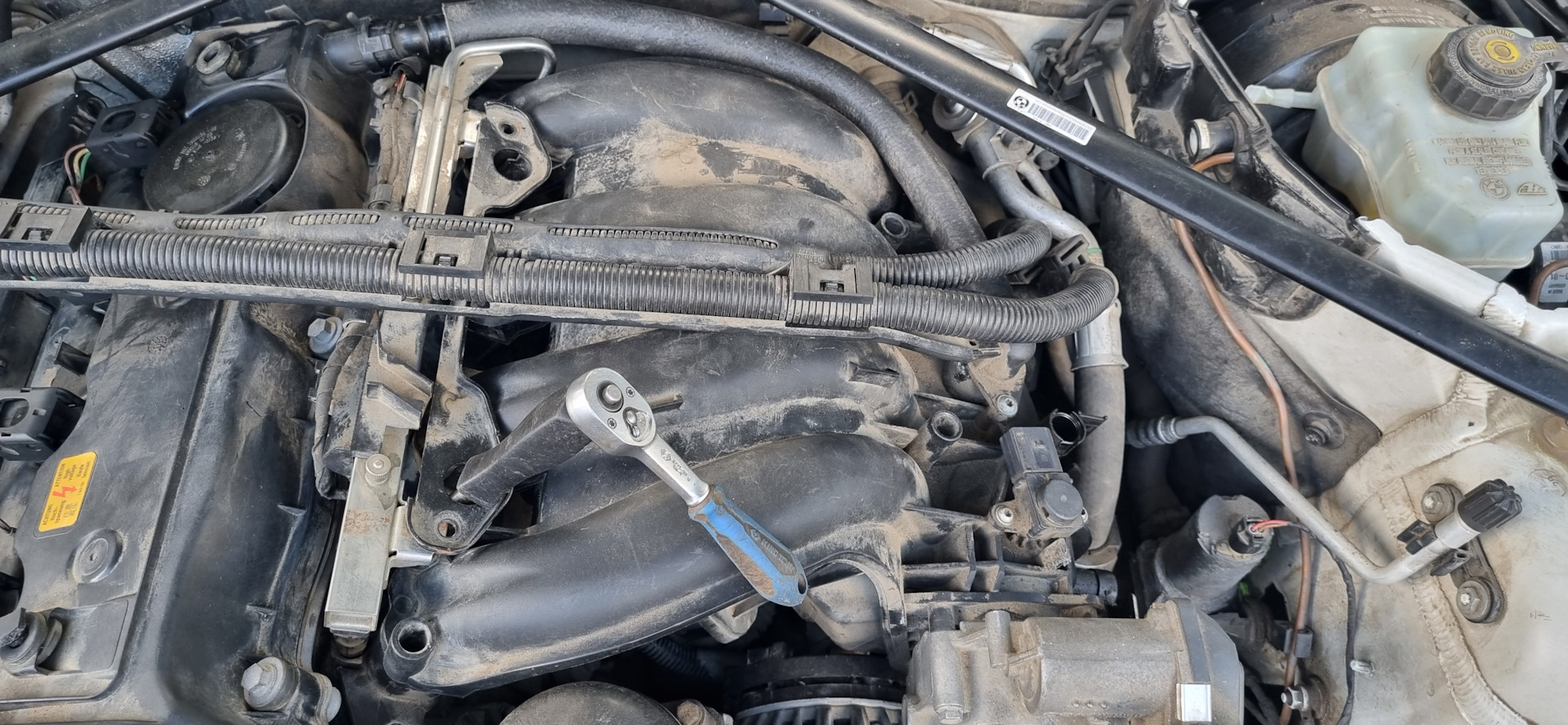 Что бы добраться до стартера нужно снять впускной коллектор. Тут нужна сноровка — тренировка). Само собой отключить провод минуса от аккумулятора. Дроссель можно не снимать, но отключить все провода и трубки, откинуть их в сторону.