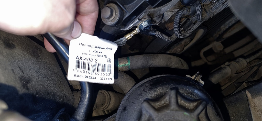 Надо думать, если с плюсовыми проводами все в порядке, а стартер не крутится даже если его замыкать отверткой, может все-таки у него нет минуса… И тут до меня доходит, что в суете я даже не пробовал подключить дополнительный минусовой провод к двигателю, возможно я об этом подумал, но увидев вроде бы целую косичку массы двигателя, я просто забыл об этом. Итак на следующий день я купил небольшую косичку от Волги, прикрутил ее к двигателю и под гайку правого амортизатора на стакане.