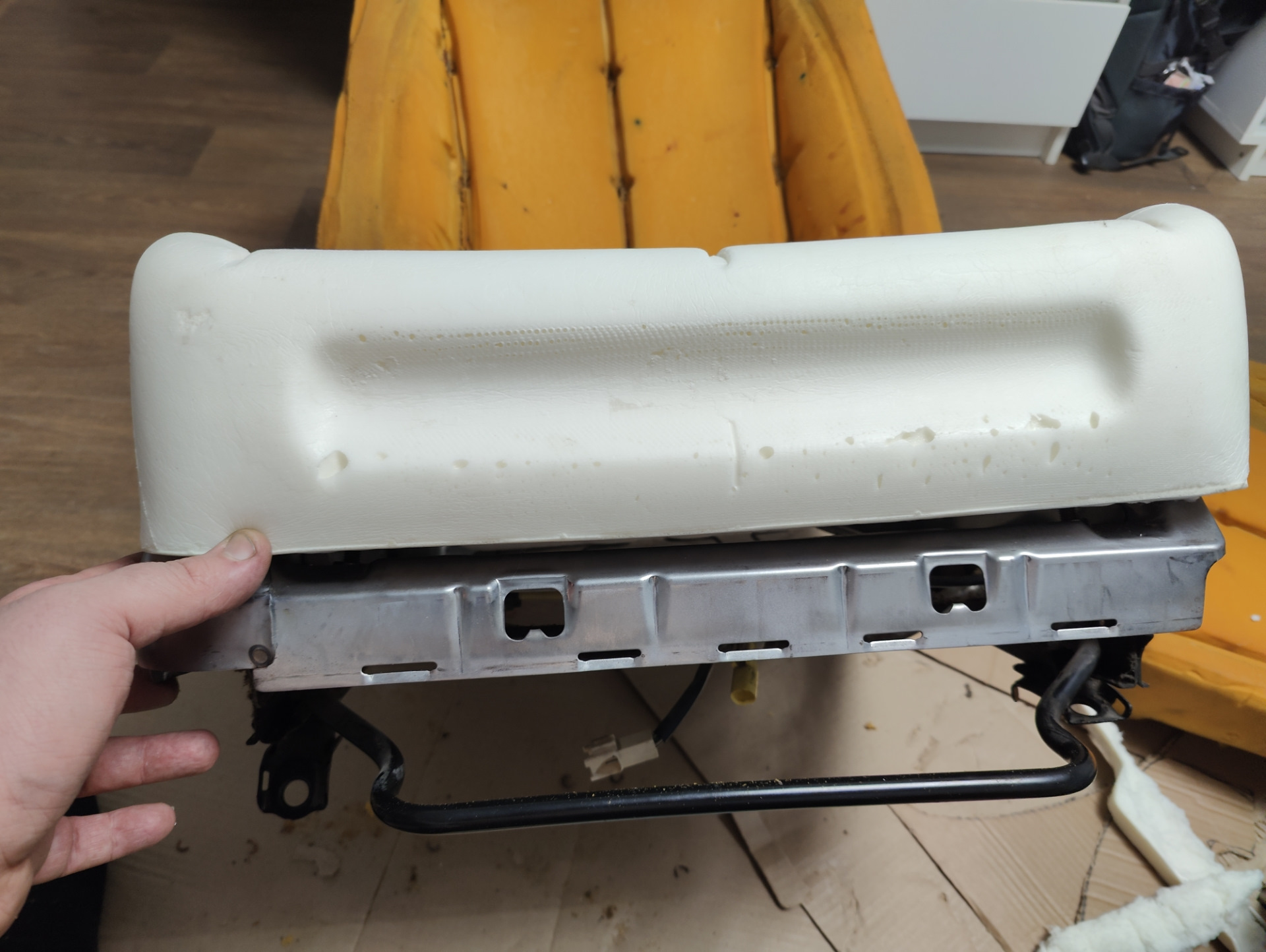 Изначально хотел найти сидушку как донора стащить поролон… Но сравнив формы под затяжку каркаса, и они разные.