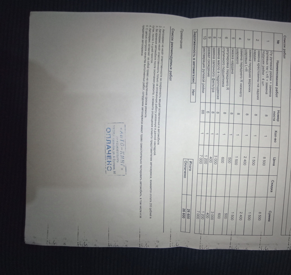 До это заезжал к своему знакомому мастеру для того чтобы он посмотрел с ходовой всё в порядке или нет. После его осмотра было такое резюме маленький люфт присутствует на рулевой желательно реставрация и так далее по мелочам. В итоге выбрал подходящий для данной процедуры день, заехал оставил авто пришлось почти на 2 дня.