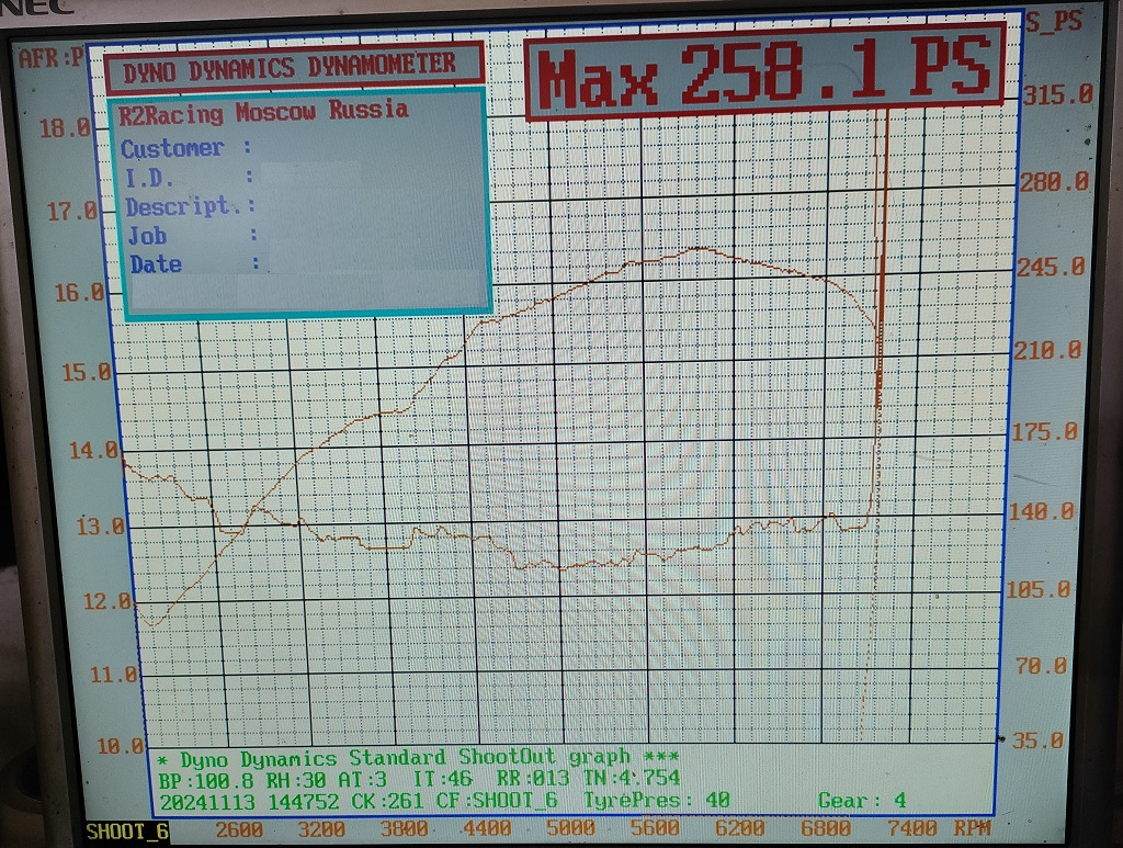 Результаты максимальной мощности в целом такие-же, что и в прошлом году, 211-212 сил на колесах, 258-259 сил на моторе, 350-360 Нм макс. момента, но немного менялась кривая момента и состав смеси в зависимости от настроек (стало чуть богаче в режиме полного газа).