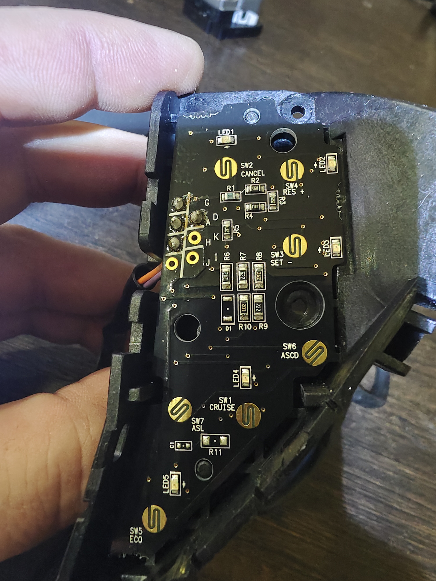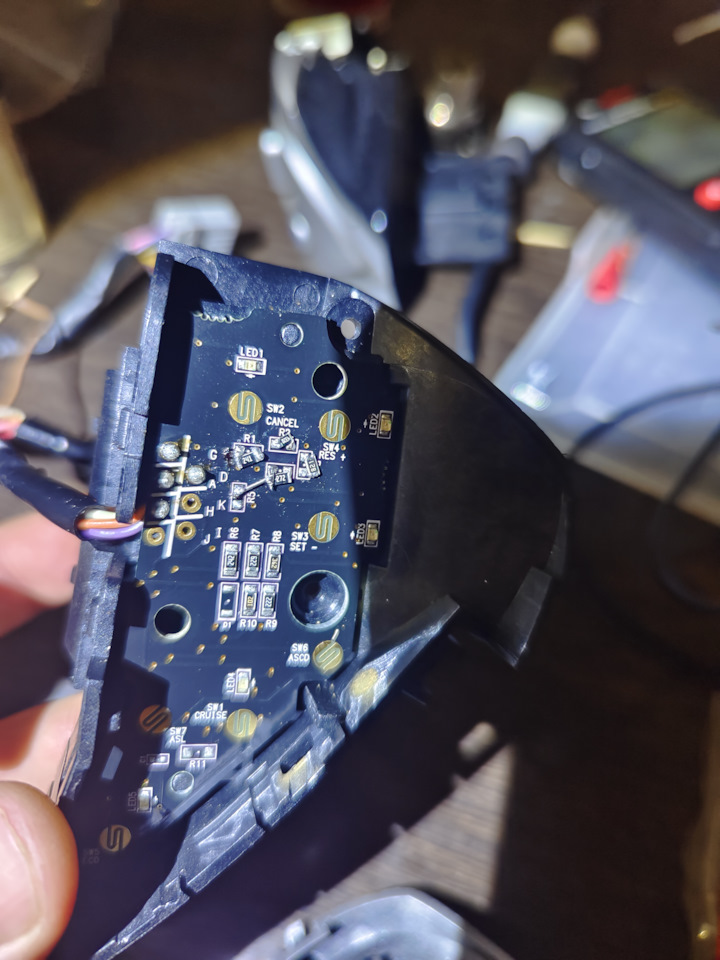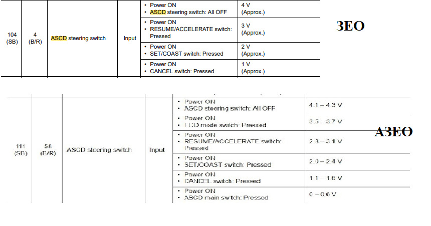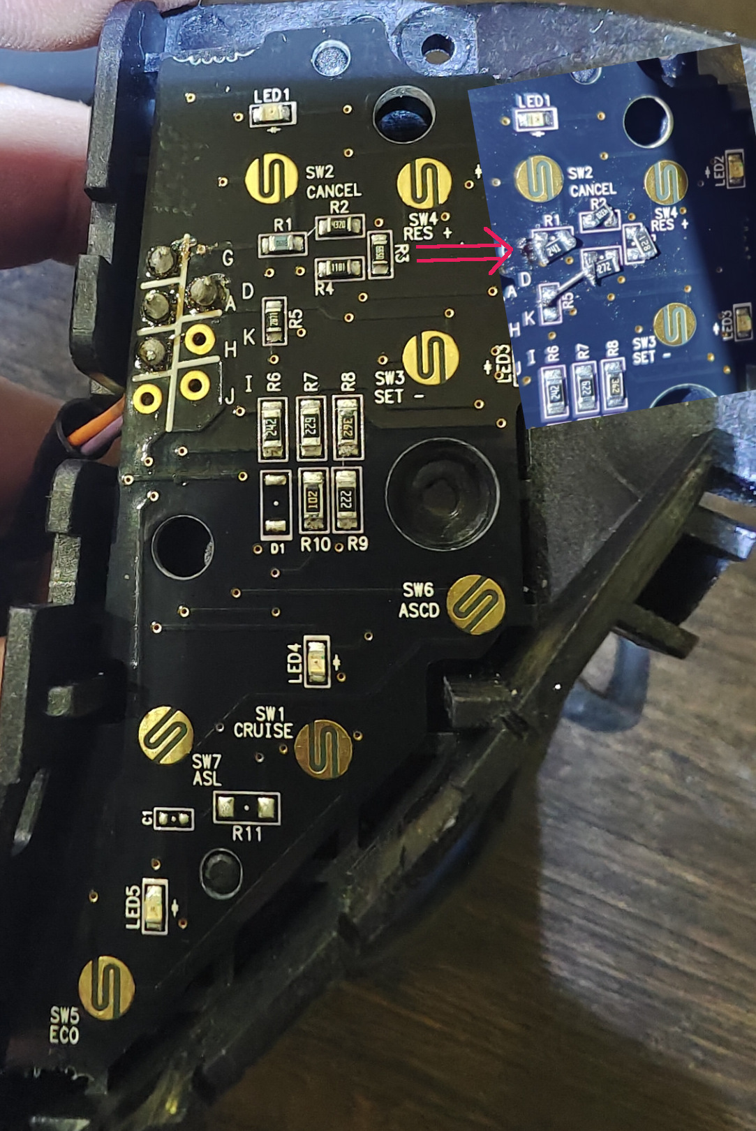 Кнопки я установил до прошивки, ни одна из них не работала на нажатие, что логично. После прошивки заработала он/офф, а остальные нет. При этом в лс висит по ним ошибка, она стирается, но после попытки использовать круиз снова прописывается — полагаю всм не видит нужных напряжений и ловит не те, которые надо) Посмотреть бы на плату кнопок от зео, какие там сопротивления стоят… Еще по схеме там у резистоов последовательное подключение, у азео добавлен резистор эко, возможно он лишний для зео и итоговые напряжения не те.
