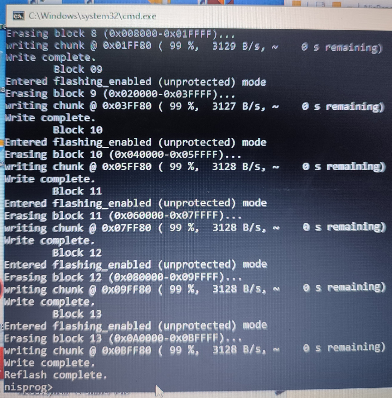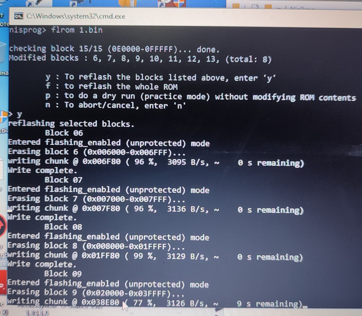 В процессе записи обязательно смотреть чего выводит nisprog, убеждаясь, что запись прошла без ошибок. Если ошибки все же возникают, то ни в коем случае не продолжать и не выключать зажигание, а пробовать залить еще раз или залить обратно бакап командой