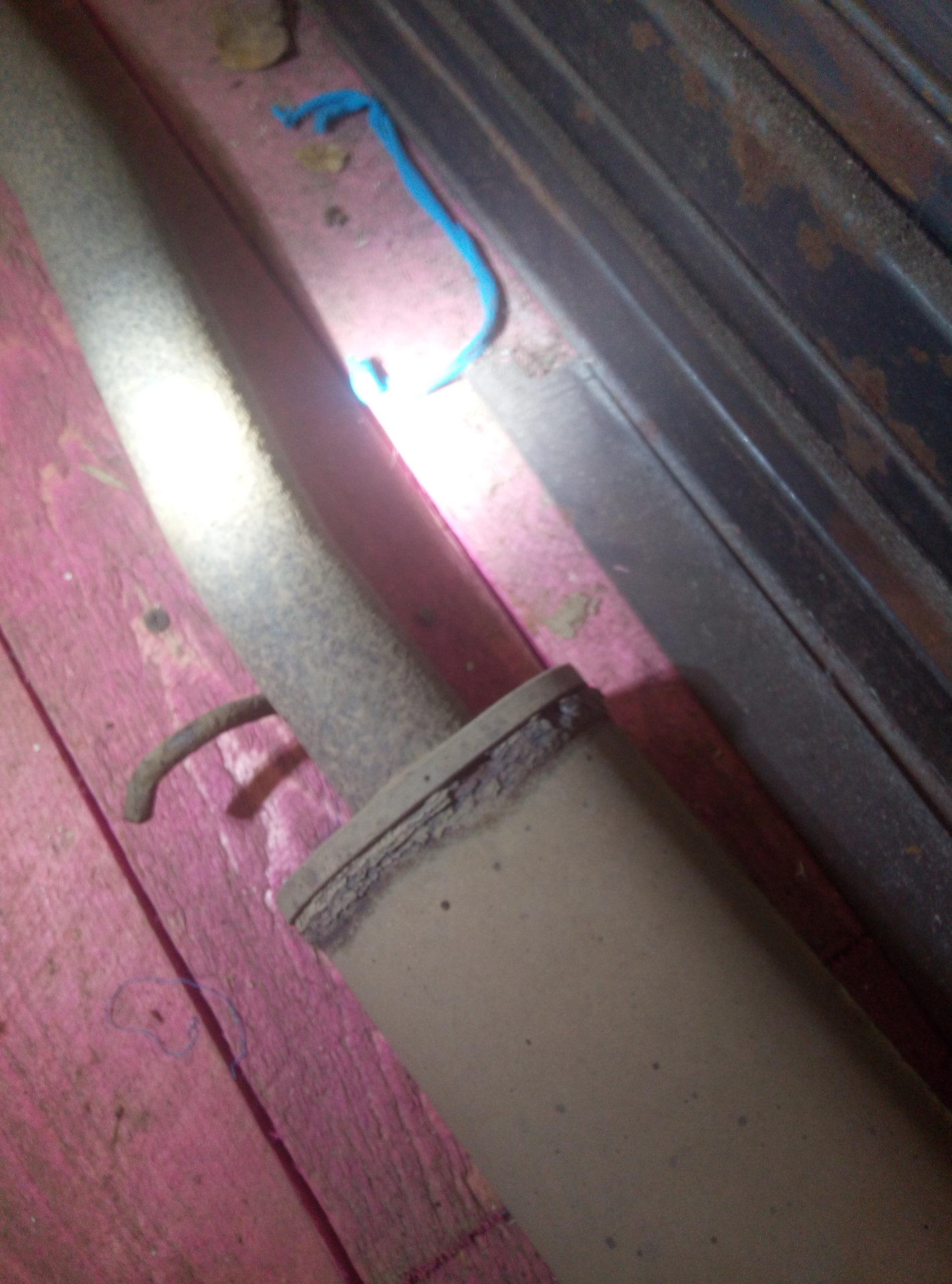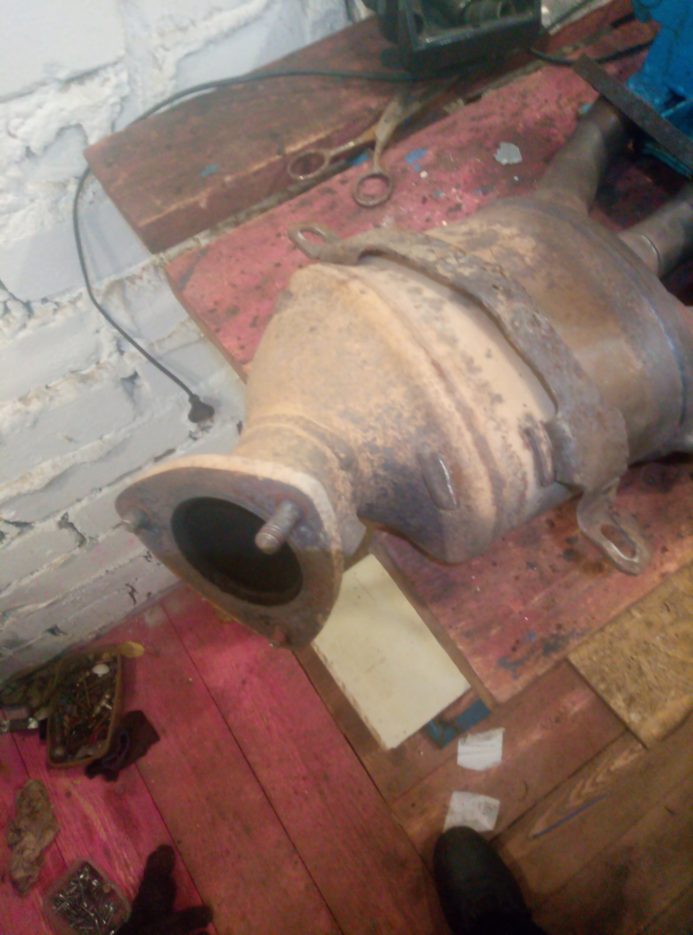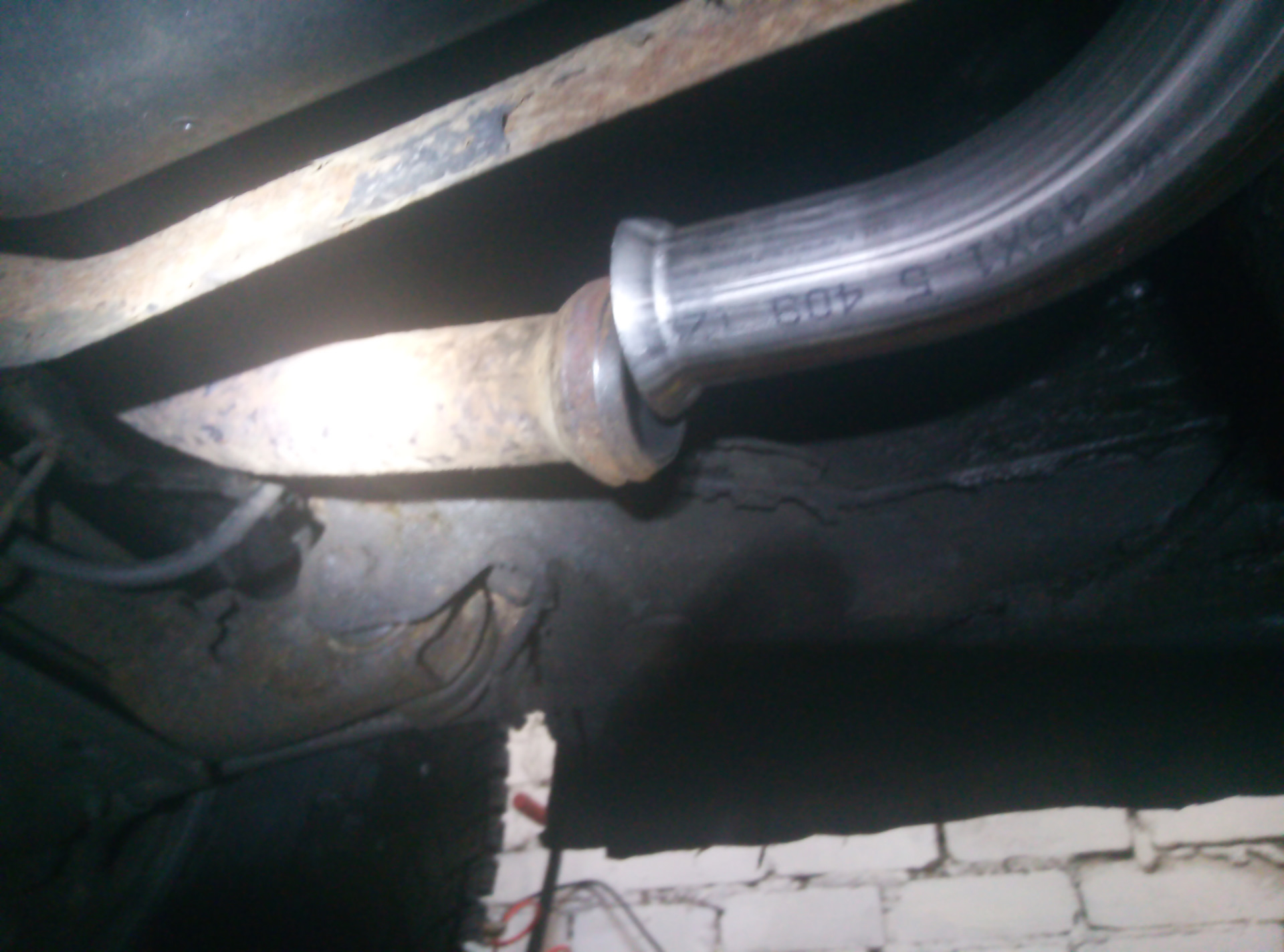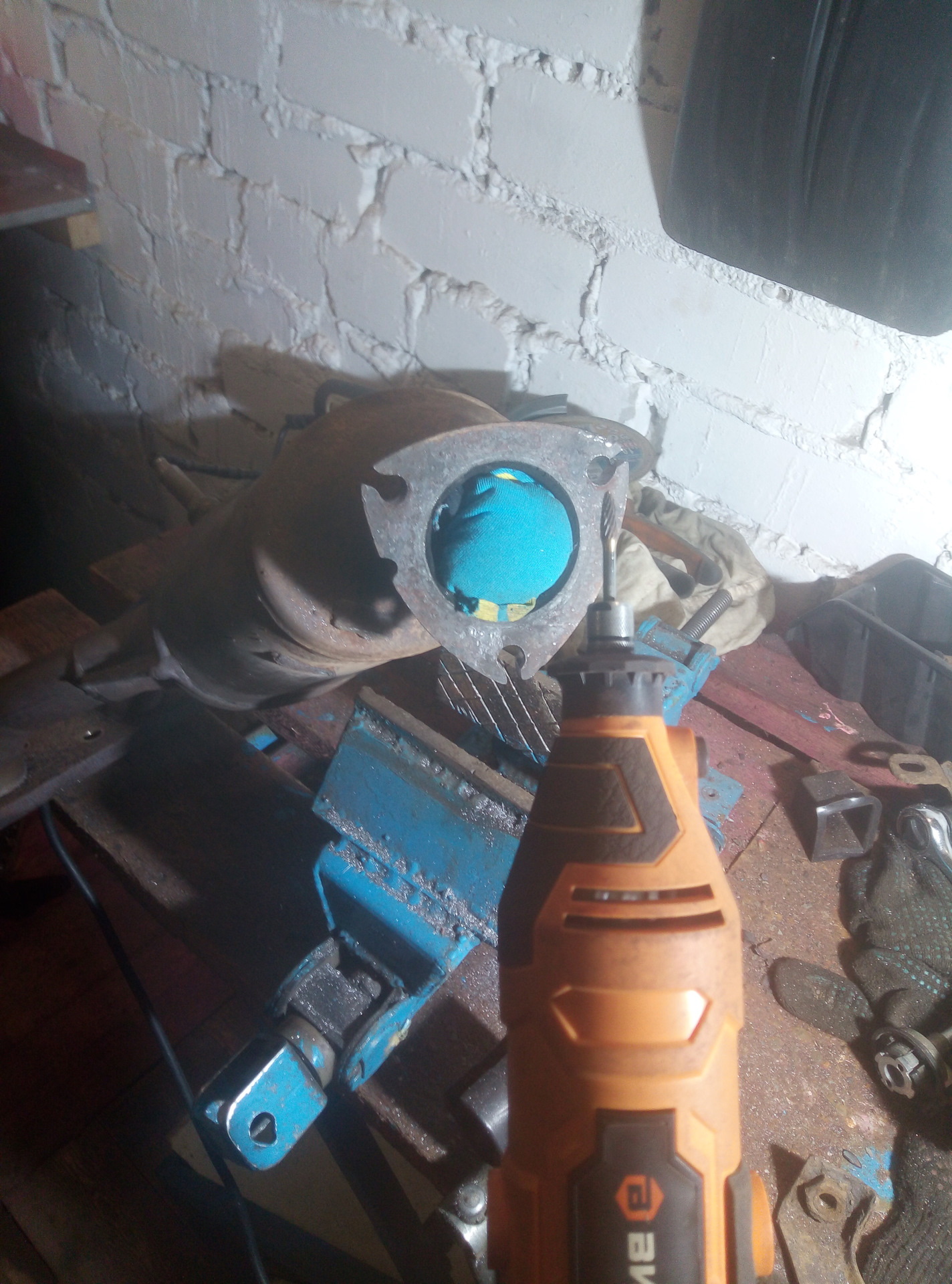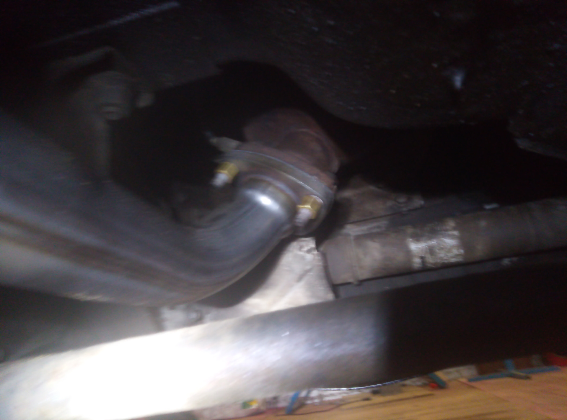 Отдельная проблема резонатор, с моей длиною ямы очень неудобно, надо либо иметь второй вход в яму, либо увеличивать длину ямы либо какой то лебедкой катать авто туда сюда под машиной, а то руками еще и в наклон небольшой из под машины тяжко ее катать, хомут тут так же походу еще с завода, ключами ни поддался в вот болгарке в легкую, кольцо соеденительное просто намертво в глушитель впаялось,