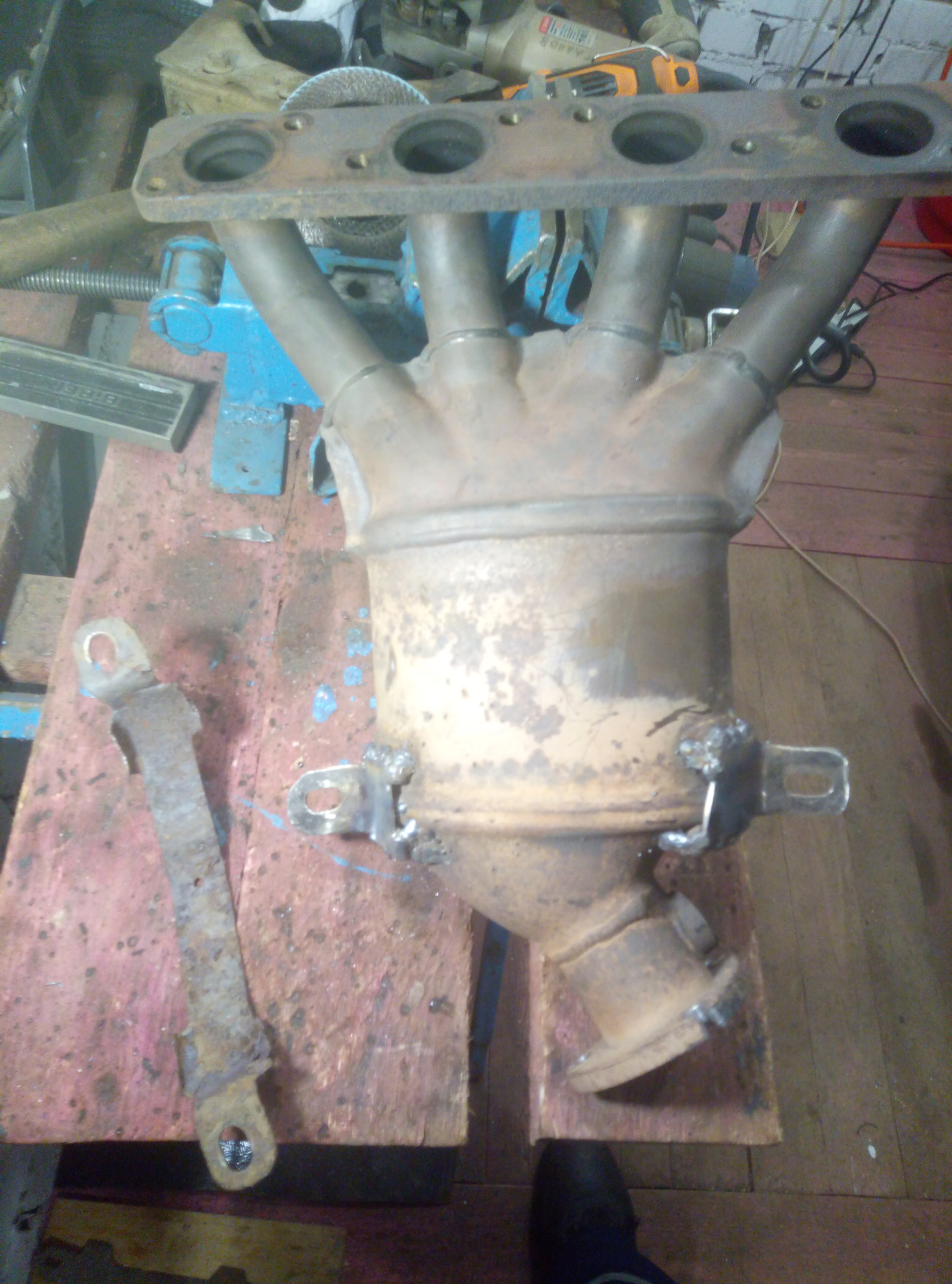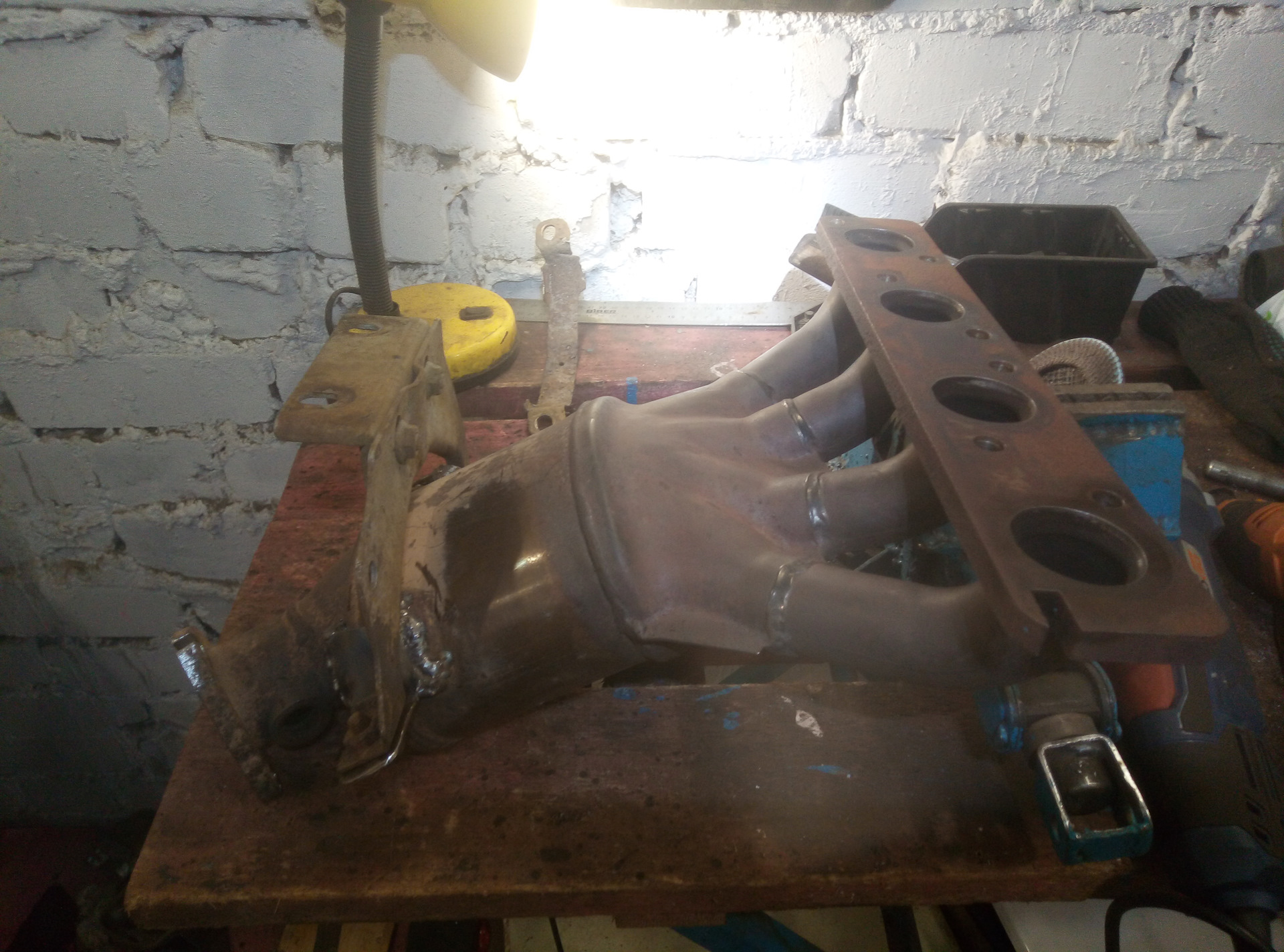 На коллекторе была и вторая проблема, отгнил отвалился крепеж кронштейна, это с одной стороны хорошо, потому как открутить его под машиной было нереально, все наглухо закисшее, а так я его пошатал он и отвалился, что позволило снять спокойно коллектор через верх, отцепив шланг вакуума, там кстати стоял по всей видимости родной не разу не тронутый еще заводской хомут ленточный, ну явно я тут первый снимаю все это. А так в тисках уже открутил пневмой кронштейн, усилие было такое что позагибало все в узлы пока откручивало, хрен бы чего я руками снизу в ограниченном пространстве открутил. Вырезал в итоге два уха из металлопрофиля, чтобы четко все подошло пришлось приварить в рабочем положении, то есть коллектор запихал назад прикрутил, потом кронштейн прикрутил, потом ухи прижал к коллектору и прихватил, да неудобно с ямы прихватывать но я справился, далее обварил покрепче.