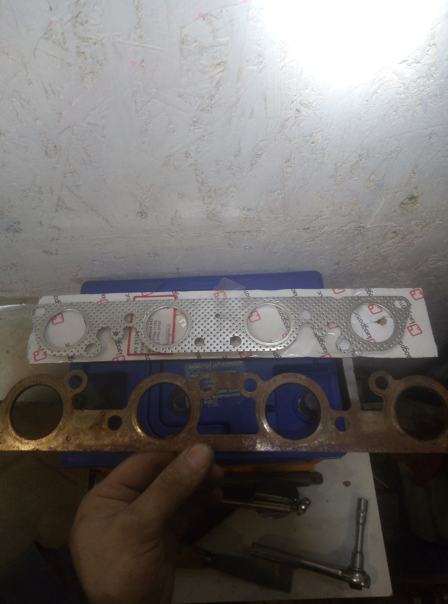 Кстати прикол, на моторе стояла еще заводская прокладка коллектора, я отправил брата в магазин, скинул фотку, сказал мотор 126, там неучи сказали что у них только под 124 мотор и что вон у вашего дырка есть в центре а у нашей нету, не подойдет, ну умники…)) Вообще то прокладка у меня тоже была с маркировкой 124 потому что мотор то один только различие в поршневой, ну а дырка по центру это вариант исполнения, с завода стоял металлопакет, в магазине был только циклеванный паранит за 150 руб, ну взял его, встало вроде хорошо.