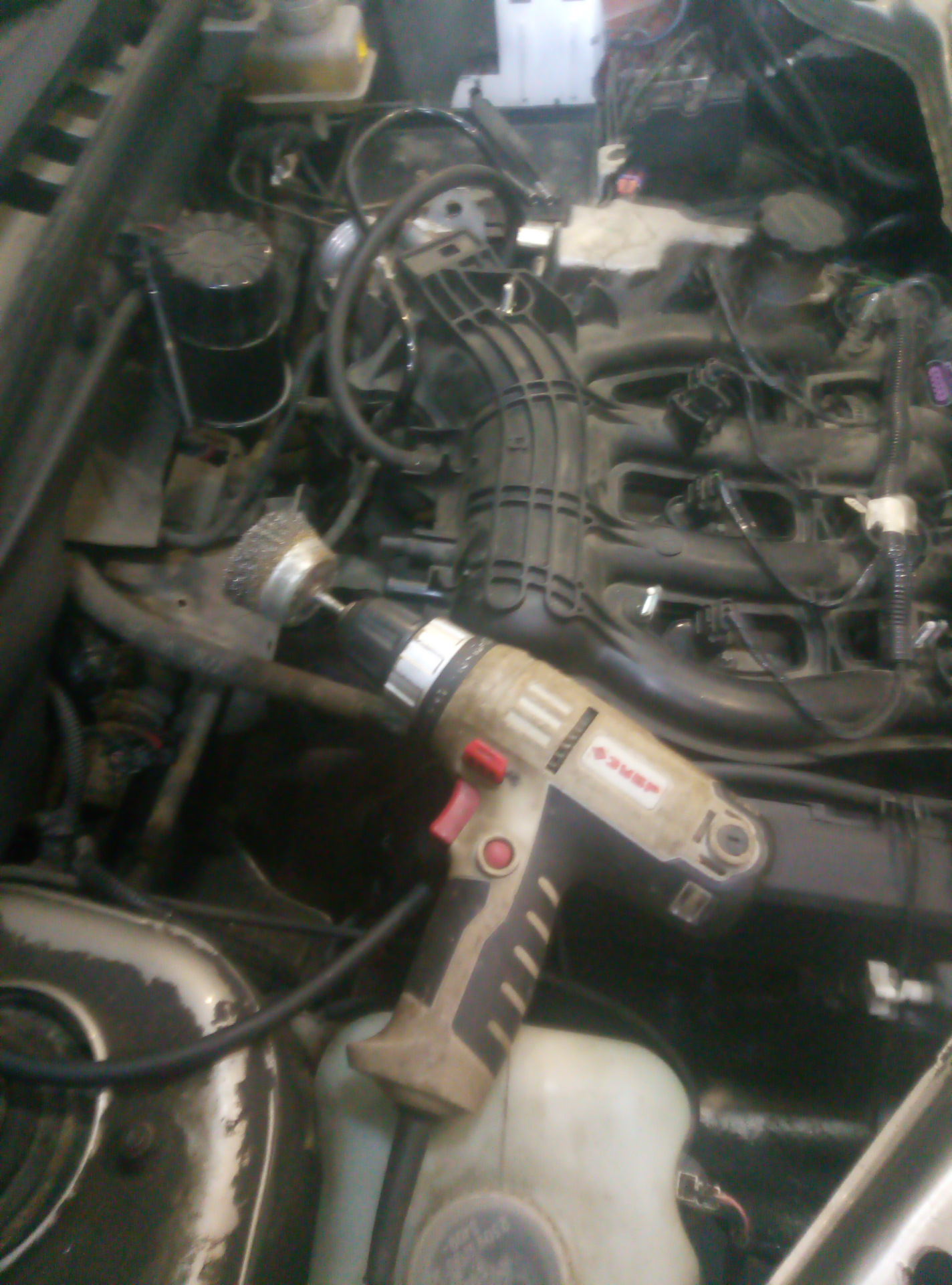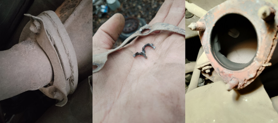 плюс гофра с небольшой трещиной, пованивает в салон, а она уже меняная была. Я надеялся раз прошлый хозяин гофру переваривал значит рассоединяли коллектор с трубой, но общий вид шпилек и гаек намекал что их с завода не трогали, похоже так оно и есть, а варили возможно как то не снимая. В общем первую гайку на коллекторе я погрел горелкой, пролил аналогом вд, пневмо гайковерт на небольшом усилии бам бам и гайка отлетает вместе со шпилькой. Окей, беру гайколом, вторую гайку ломаю, потом пневмой откручиваю, получилось, но пол шпильки по середине тупо нету, сгнил сгорел металл. Третюю гайколомом сломал, опять пневма и снова отлетает гайка вместе со шпилькой. Таким образом получаем проблемку. Так как работать в яме неудобно и холодно, принято решение снимать весь коллектор.