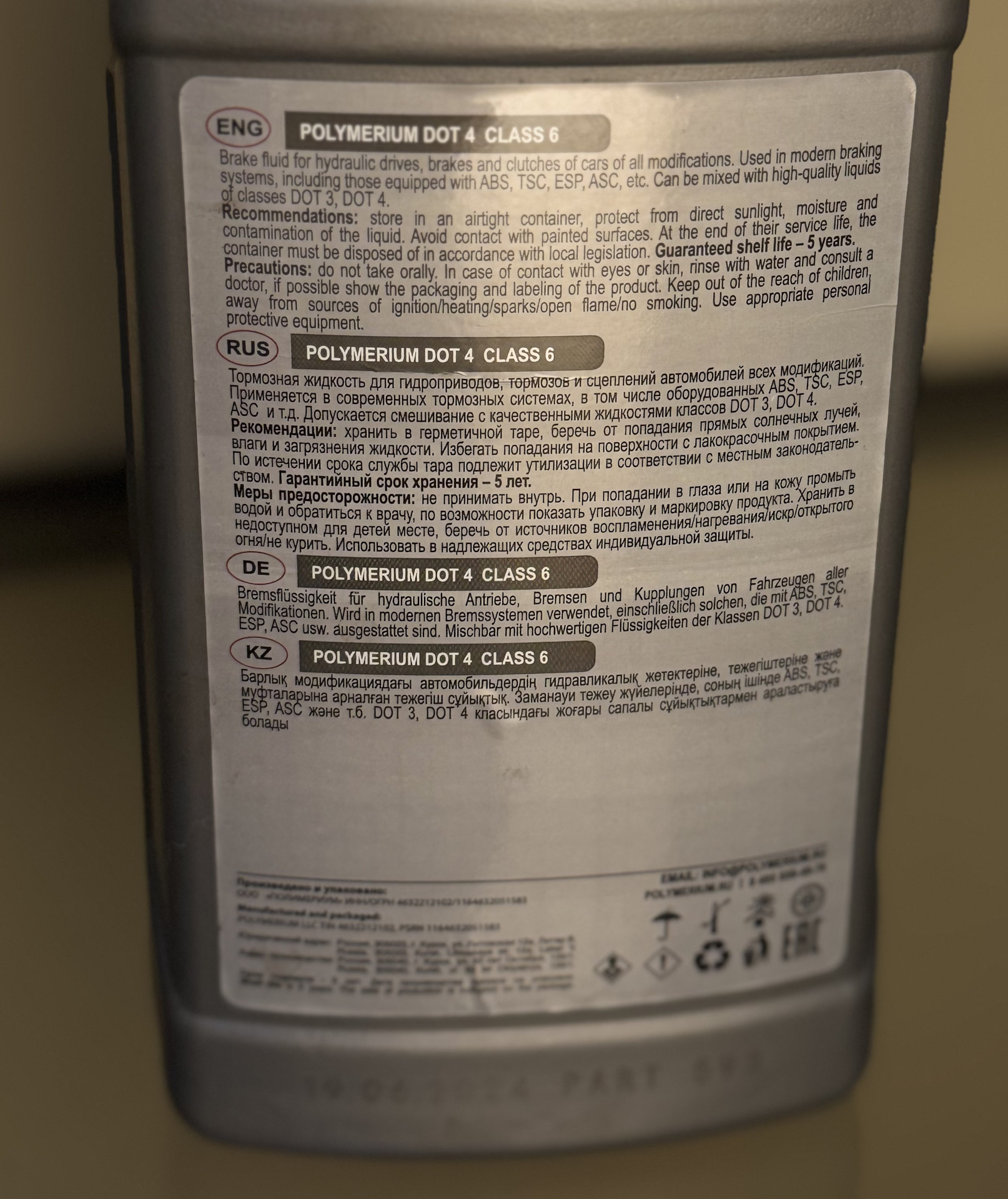 Поскольку цена на тормозную жидкость ATE SL6 стала невероятно высокой, решил попробовать более бюджетный вариант POLYMERIUM DOT4 CLASS 6.