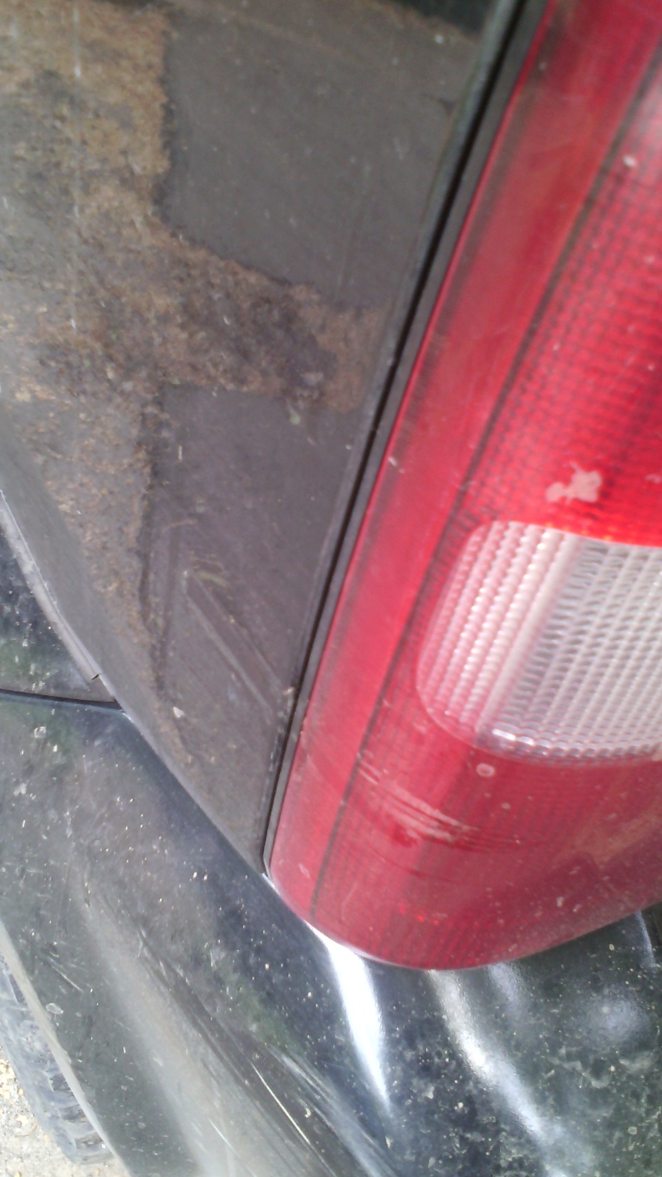 А если серьёзно сдавал назад, разворачиваясь в ограниченном пространстве и наехал на дерево, да так неудачно получилось что ствол прошёл в стороне от трубы и навалился на боковую поверхность бампера и заднего крыла, мелочь, а не приятно…