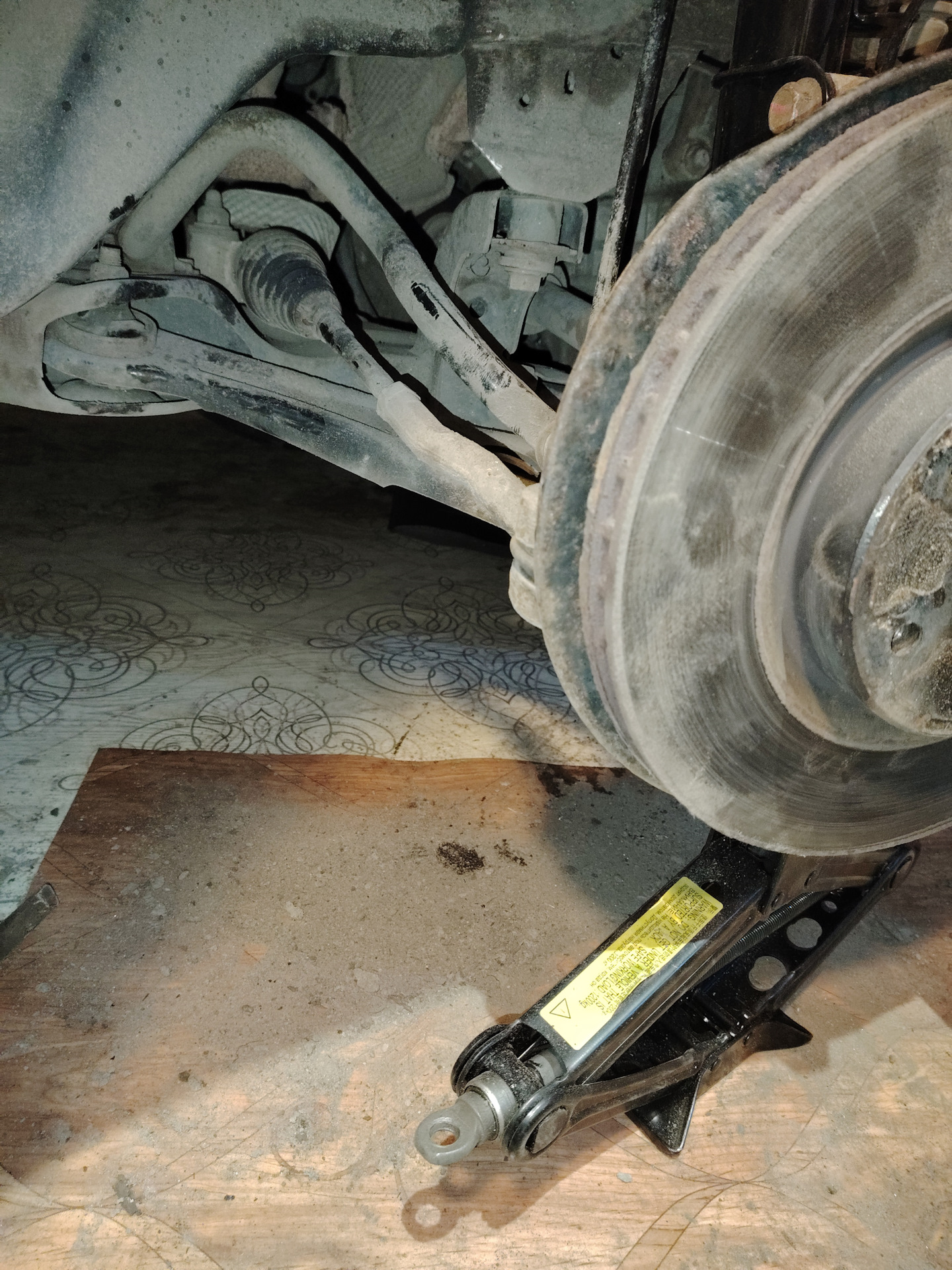 3. Чтобы не повредить резьбу косточки подставить домкрат под шаровую опору и поднимать рычаг до тех пор, пока косточка свободно не выйдет из уха аморта. Опустить домкрат, пока рычаг не вывесится.