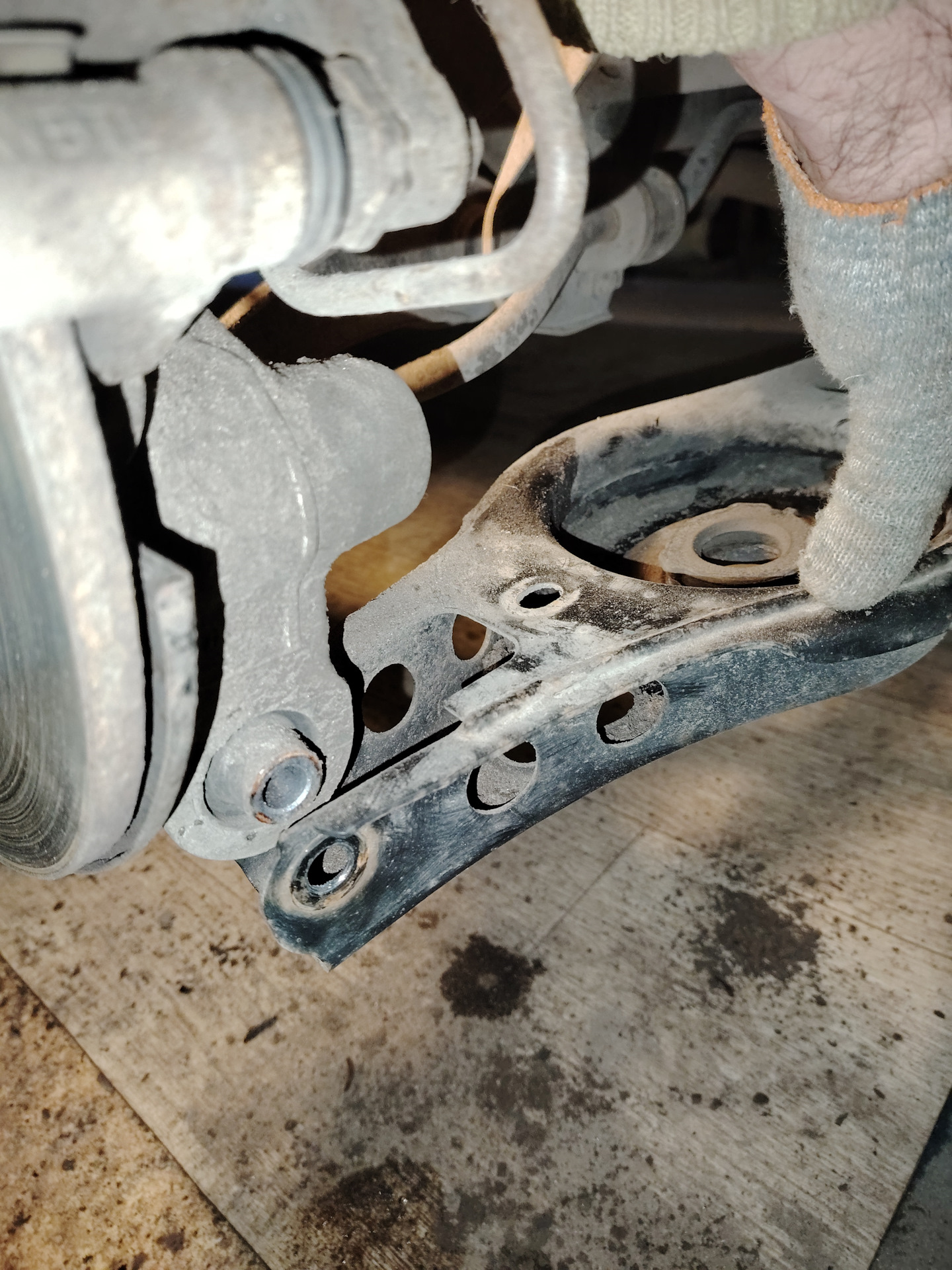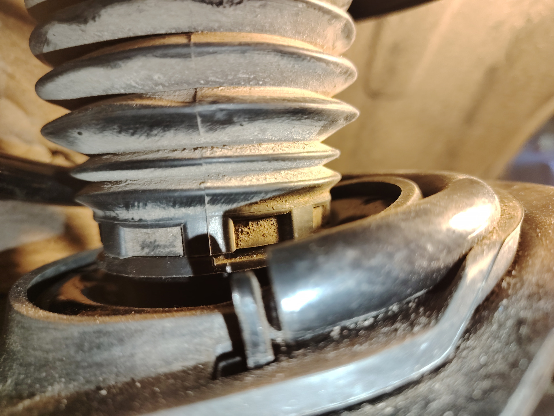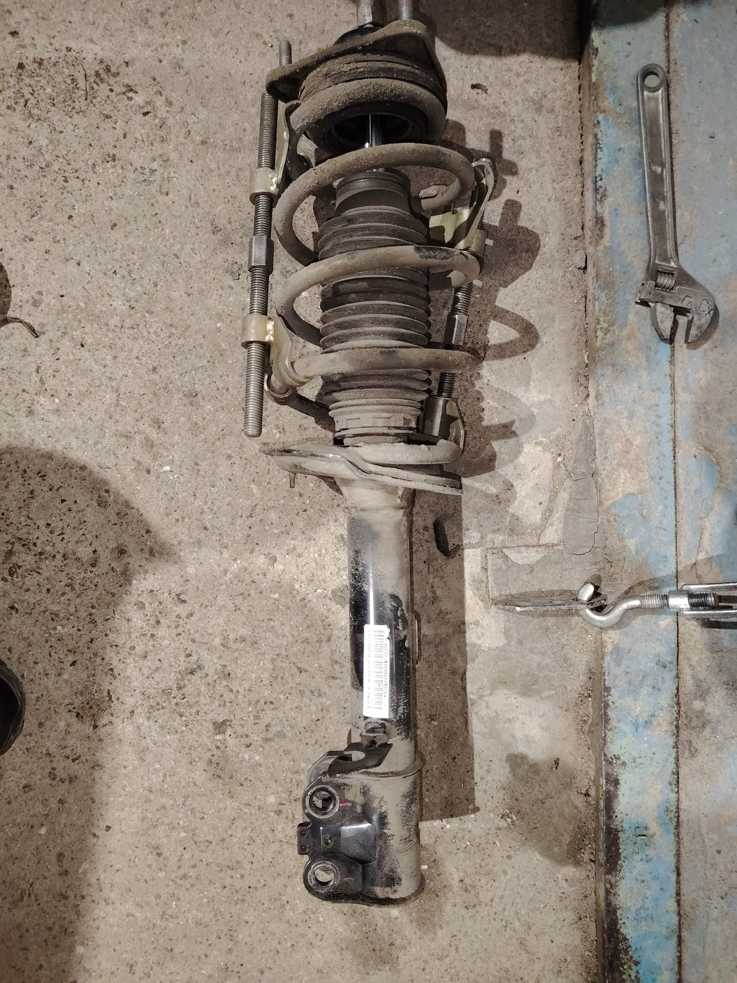 Чтобы снять аморт окончательно, высверлил резину внизу и скинул аморт прям через болт, благо отверстие позволяет это сделать. Втулка естественно осталась на месте. Дальше срезал с втулки остатки резины, взял газовый ключ и стал пробовать свернуть саму втулку. С невероятным трудом свернуть ее всё-таки удалось. И вот только после этого, лежа под машиной, как следует зажав болт за ободок головки газовым ключом, жимом от себя удалось сдернуть его с места! Как-будто штангу полутонную отжал… Руки тряслись дико! Самое интересное, что на нем не было ни следа окисла или ржавчины! Видимо, произошла адгезия металла поверхностей втулки, болта и диска, другого объяснения просто нет…