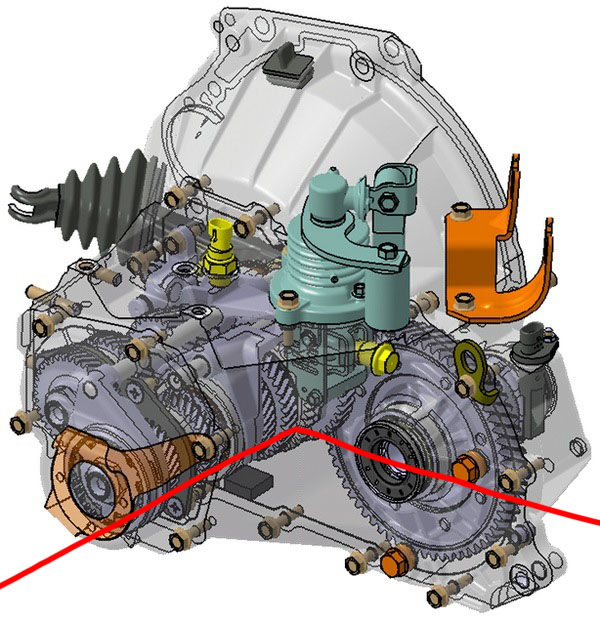 Нашел несколько фотографий картера коробки, где условно можно провести уровень. Спозиционировав корпус мкпп так как она установлена в подкапотном пространстве и проведя условный уровень по заливной пробке. Мы видим что уровень масла кое как доходит до подшипника вторичного вала коробки. Даже если уровень будет на 1см выше большой разницы от этого нет, так как у нас практически не достает масло до уровня подшипника первичного вала.