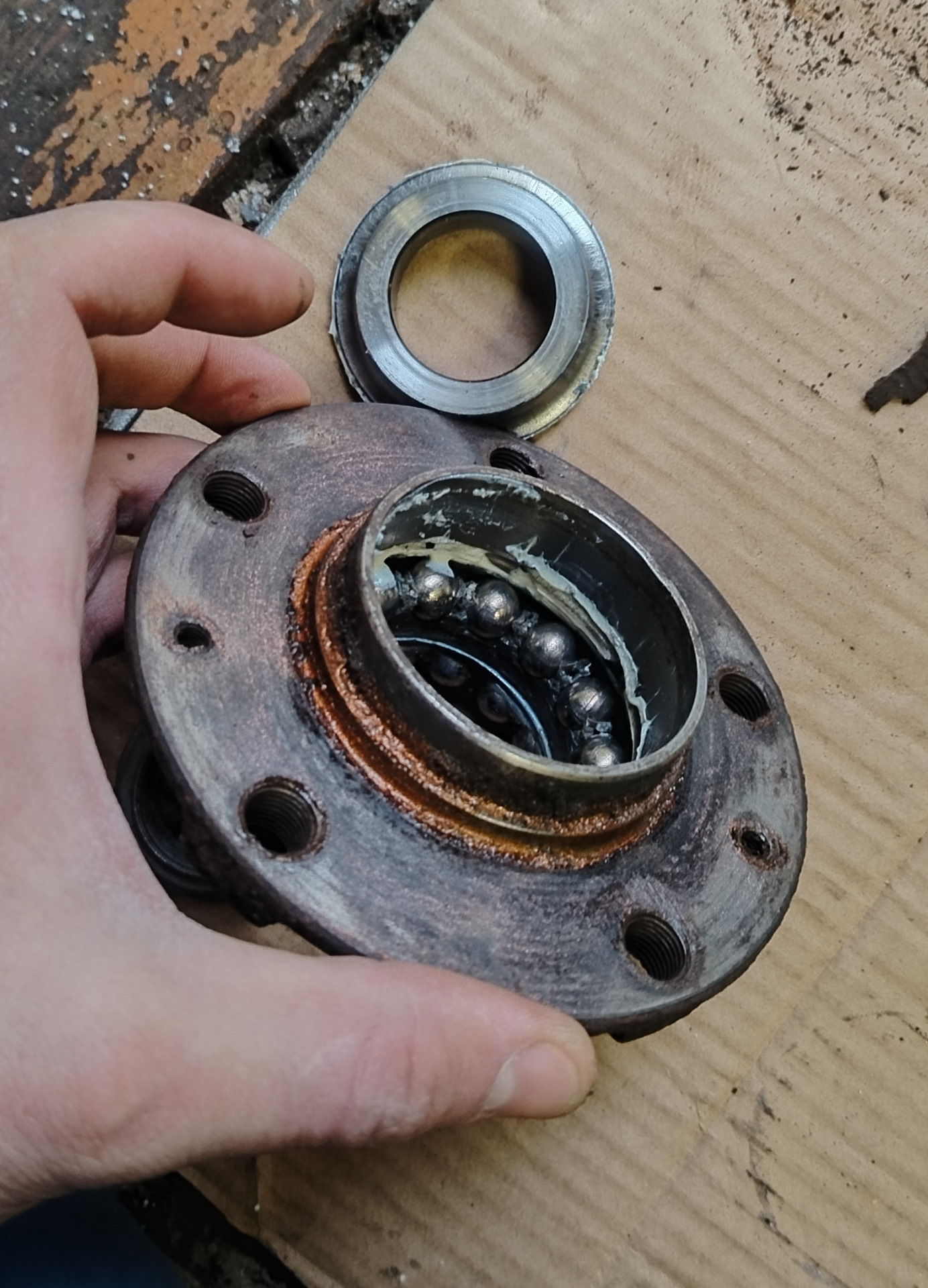 Стипица снялась нормально, смазка ещё была, следов воды не было, шарики круглые, без повреждений и следов износа, ржавчины нет. Всё очистил, помыл, сбил старое кольцо ABS, почистил хорошенько посадочное место, чуть смазки нанёс и оперев новое кольцо на деревяшку, сверху поставив ступицу и по ступице постукивая ступица вошла в посадку кольца.