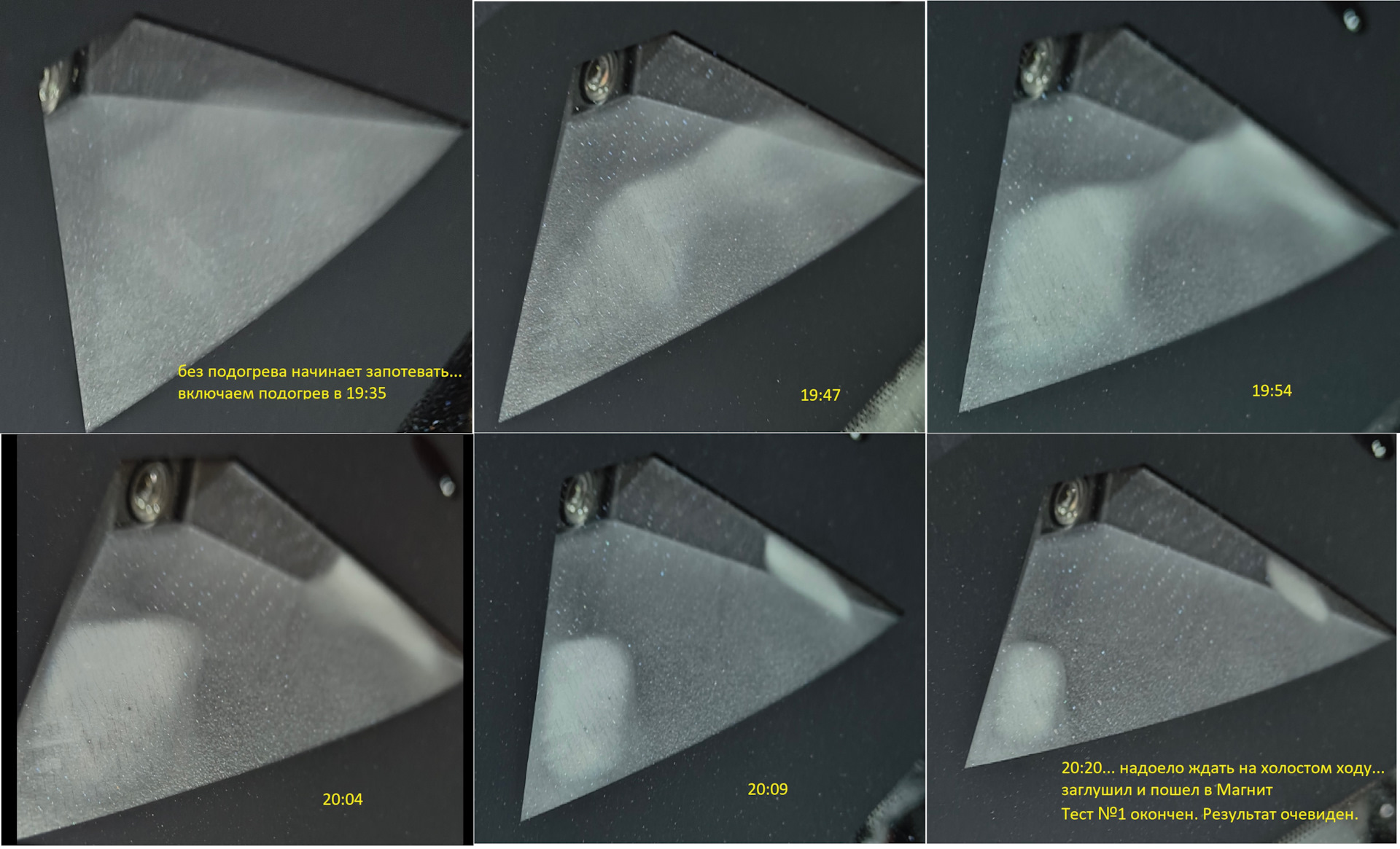 Да, видел уже такой подогрев. Но, тут такое дело… У ВАГа площадка над этим приклеенным подогревом решетчатая. Она пропускает нагретый воздух вверх и дает прогревать область между сектором и стеклом.