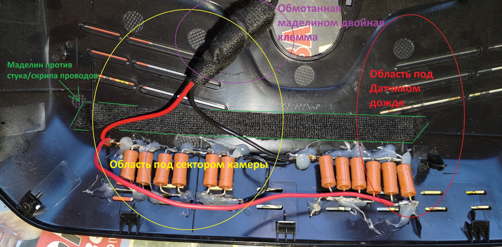 — После получаса езды — рукой через пластик ощущается тепло от двух областей снизу за зеркалом в районе прорезей в крышке, ровно там, где прикреплены резисторы, но вот прямо «жары» внутри крышки никакой нет — площадь охлаждения очень большая для такого слабенького нагрева. Т.е. нагревается только то, что находится прямо над резисторами: сектор камеры + Датчик Дождя. То, что и нужно было.