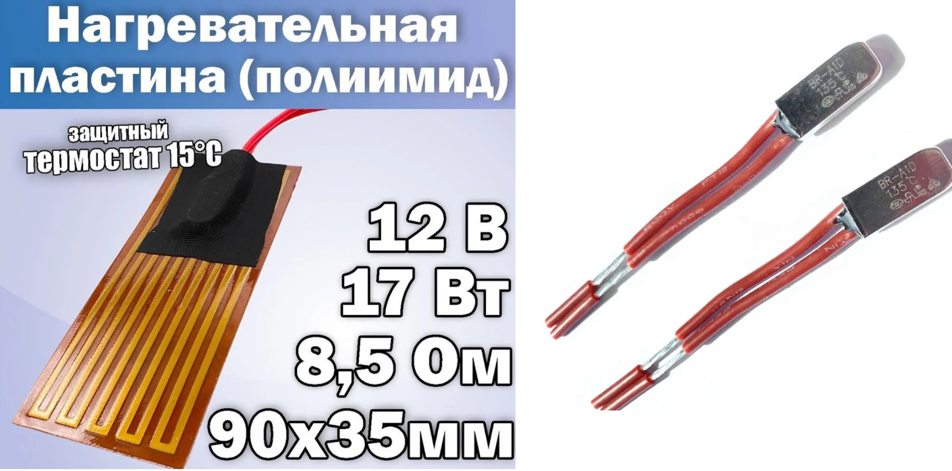 Размер — прям как у нас площадка-сектор (промерял/уточнял разумеется = подходит). Вроде норм, но есть нюанс ))) Терморегулятор внутри — примерно как справа на картинке. Проблема в том, что он быстро нагревается от пластины и… дооооооолго остывает. Получаем ситуацию, что пластина нагрелась за 10 секунд — термовыключатель нагрелся и разорвал цепь — пластина остыла быстро, а сам термовыключатель под липкой лентой еще минуты 2 как горячий до остывания и включения следующего цикла нагрева. Т.е. если просто пластину приклеить к пластику — нагрев скорее всего будет не очень хороший. По-уму — нужно лепить нагреватель, к примеру, на алюминиевую площадку (чтоб она имела хорошую теплоемкость). Но — у нас там некуда особо крепить площадку, да и места вообще кот наплакал. Кроме того, если лобаш вдруг под замену — то нельзя крепление делать на пластике стекла и нужно варганить что-то на корпусе крышки.