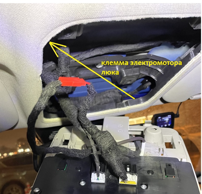 Клемма электромотора люка находится как указано по стрелке (как снимать плафон — можно глянуть тут «www.drive2.ru/l/643168398…sclid=m502rjaea9348710411»)