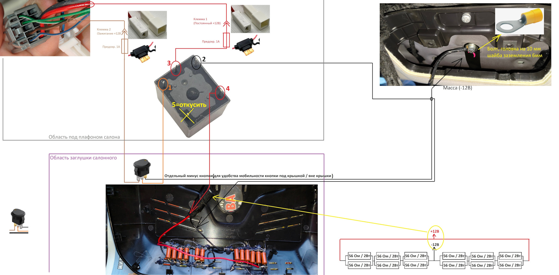 — если тумблер включен и зажигание включено = включается светодиод на тумблере, включается реле, замыкает контакты 3 и 4 = тем самым подает питание на резисторы и они начинают нагрев.
